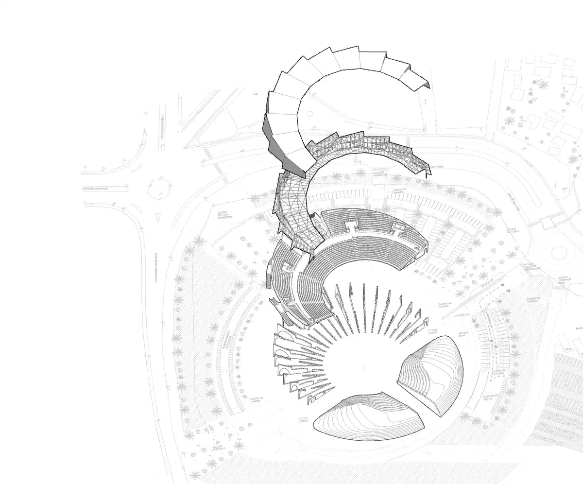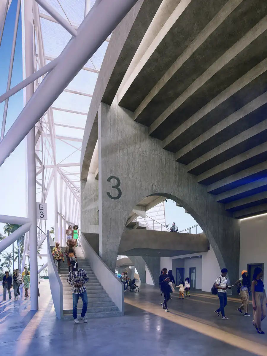 The site, located between the river boundary of the city and its main entrance, gives the project a strong urban dimension. The Arena is not limited to its role as a performance venue: it is also envisioned as a public square, a place for walks and leisure for families, contributing to the revitalization of the riverbanks and the creation of a new social hub in Porto Novo.