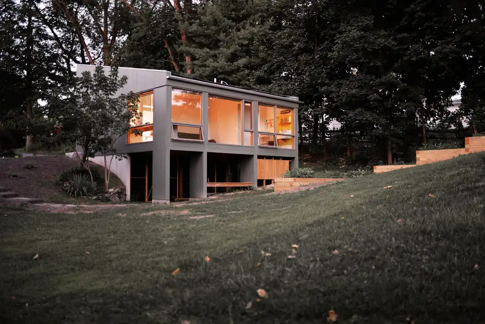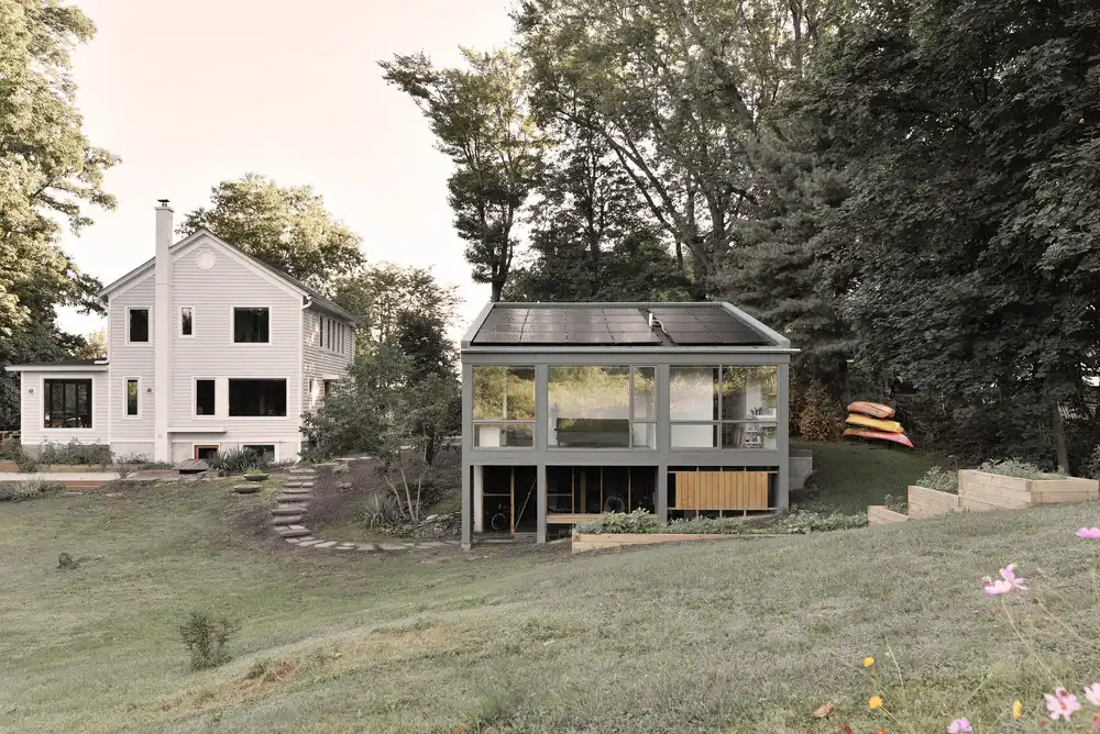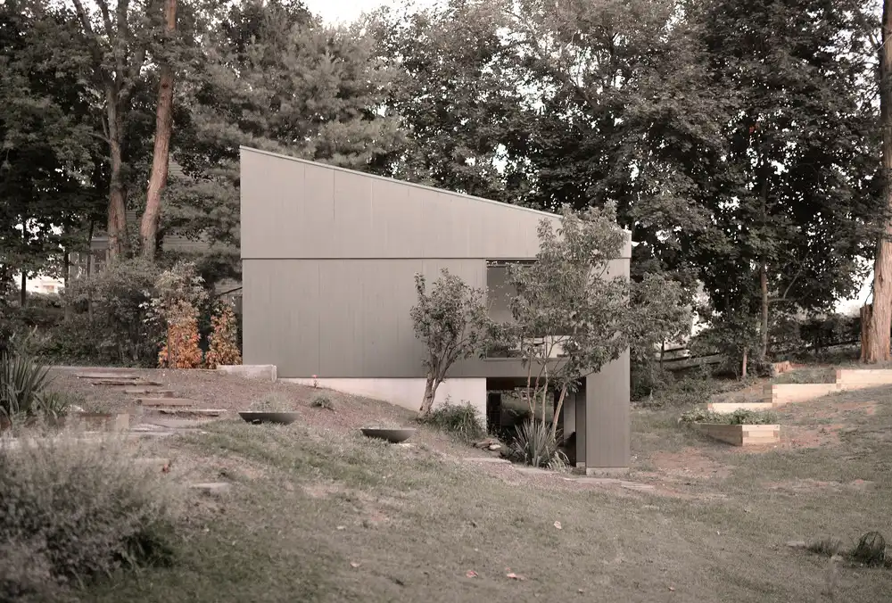 The Studio is positioned on a steep slope next to a recently renovated 1800s farmhouse, creating an entry courtyard for both buildings framed by mature trees. Its roofline follows the natural slope of the topography as it drops away, concealing the building mass from the direction of neighboring properties, while creating an ideal space for solar panels on its south-facing facade.