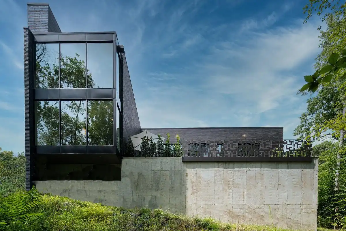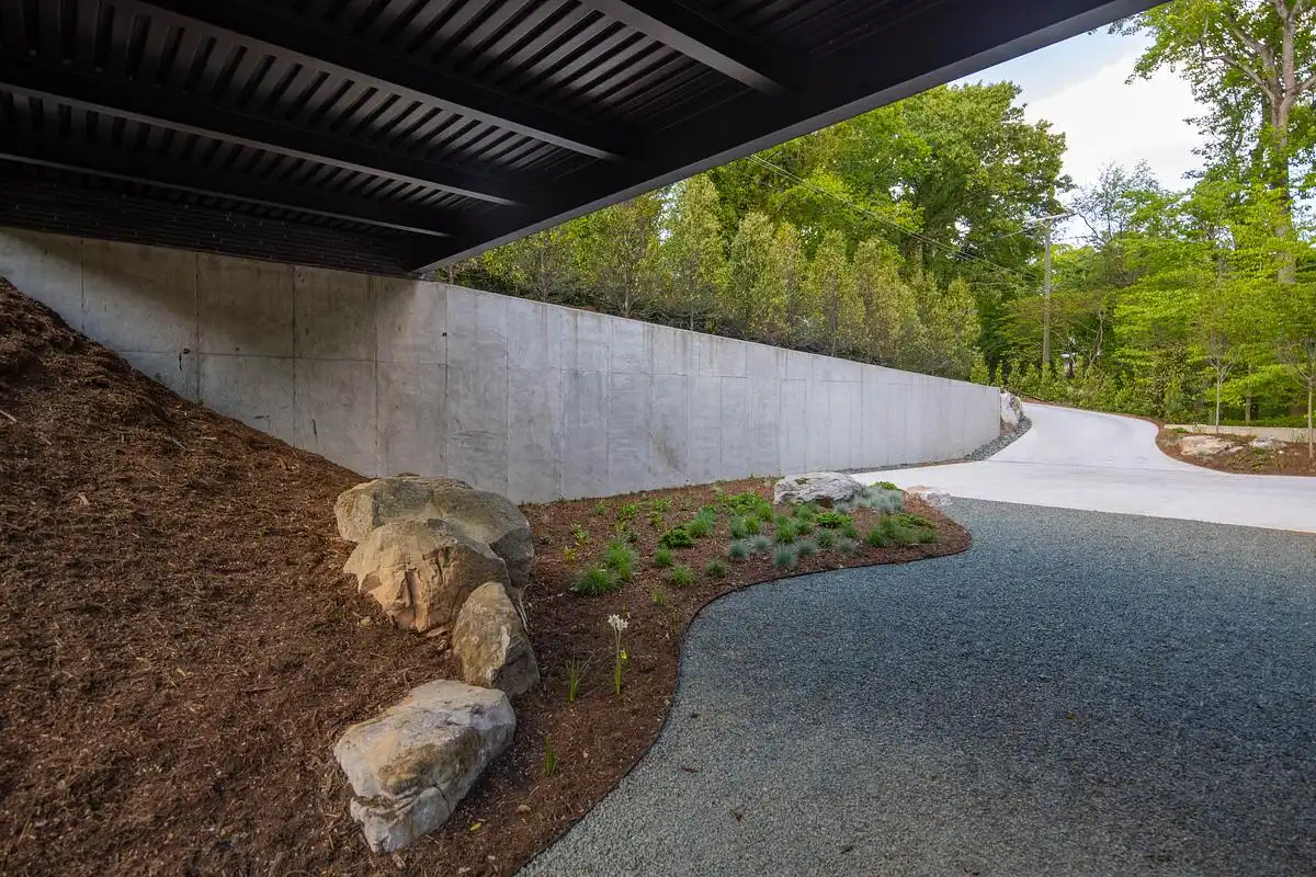 An entry court with perennial gardens provides a dramatic entry leading the visitor into the upper level of the home, displaying the client’s art collection and providing circulation throughout the house.