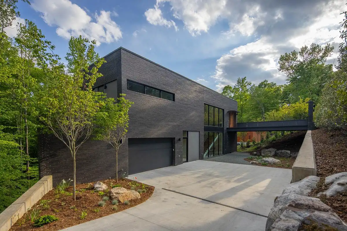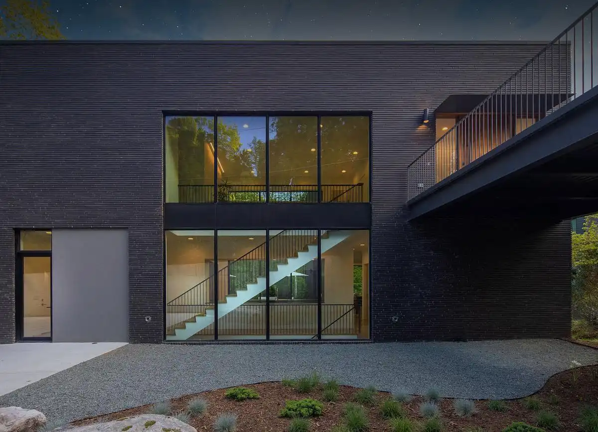 The design respects the fabric of the Chapel Hill neighborhood by matching the scale and facade line of its neighbors and utilizing a handmade black brick.