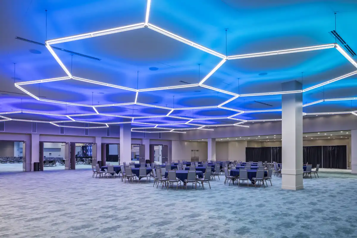 Inside, the renovation includes modernized event spaces, allowing the Dayton Convention Center to accommodate a wider range of events. A standout feature is the conversion of part of the exhibit floor into a “Flex Hall,” a versatile multipurpose high-level ballroom space that complements the existing hall. The Flex Hall allows the venue to better cater to banquet, meeting, and exhibit events, rebalancing the building’s space offerings to address their current market demand. Floating ceiling clouds and color changing lighting technology help enhance the guest experience, with high-quality acoustic elements for optimum sound quality. This strategic reconfiguration enables the center to host a broader range of events, from large conventions to smaller, more intimate gatherings, all while maintaining seamless service and increased functionality.
