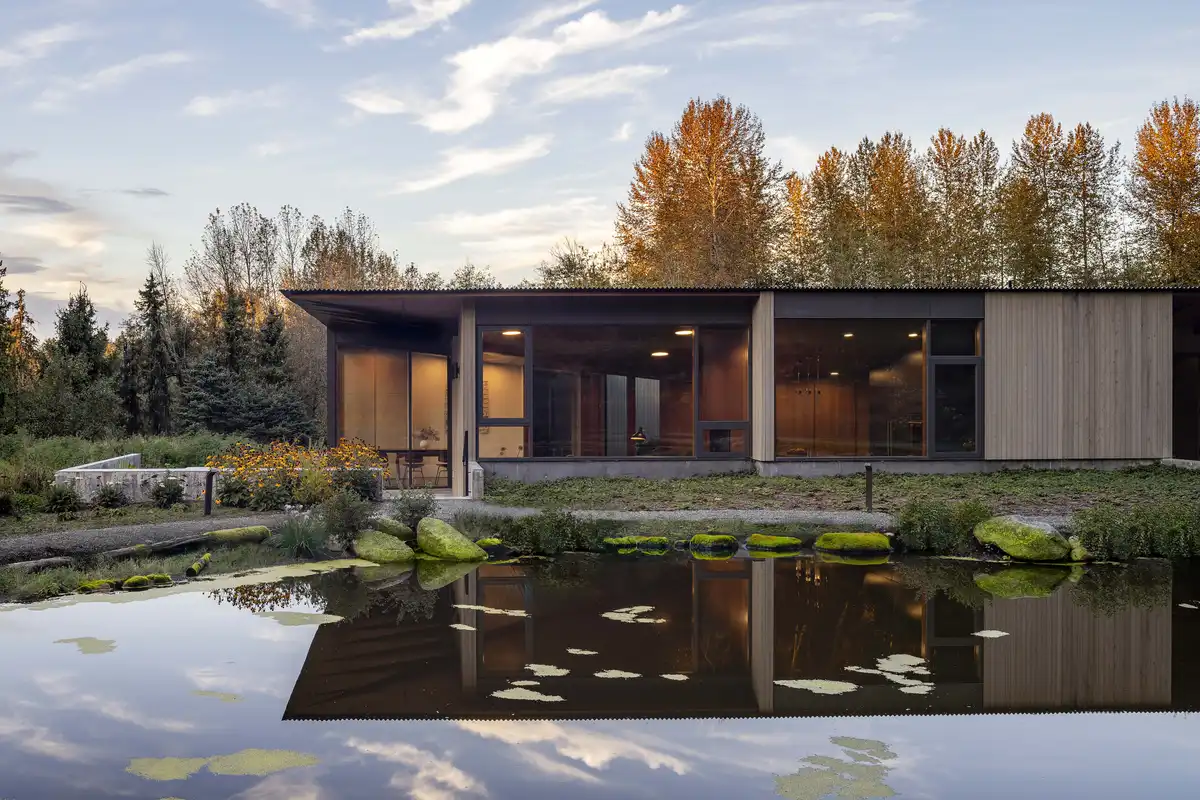 Cast-in-place concrete floors with hydronic radiant heating extend onto patios and walkways, linking interior and exterior experiences. Overhead, a corrugated metal roof with a soft metallic sheen quietly reflects the changing light.