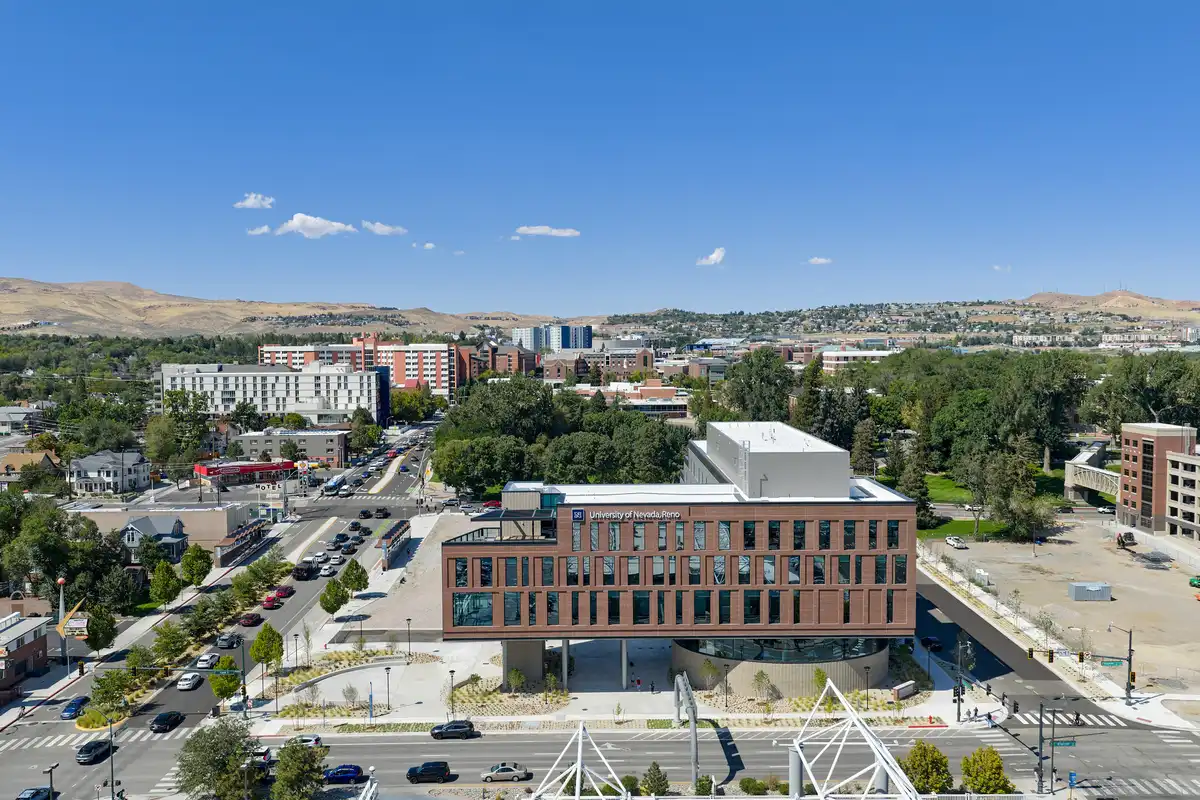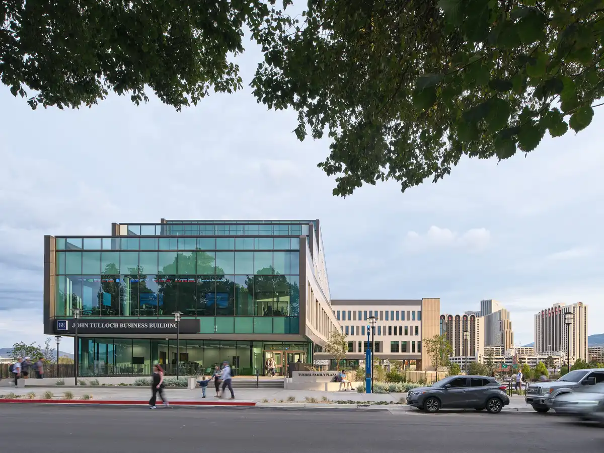 Seattle, Washington – December 9, 2025 – LMN celebrates the completion of the John Tulloch Business Building in Reno, Nevada. Positioned on the burgeoning southern edge of the University of Nevada, Reno campus, the project is part of a significant new development that acts as a bridge between the university and the City of Reno. Establishing a welcoming campus gateway, the building draws the community in, creating a new front door on the university’s southern perimeter.
