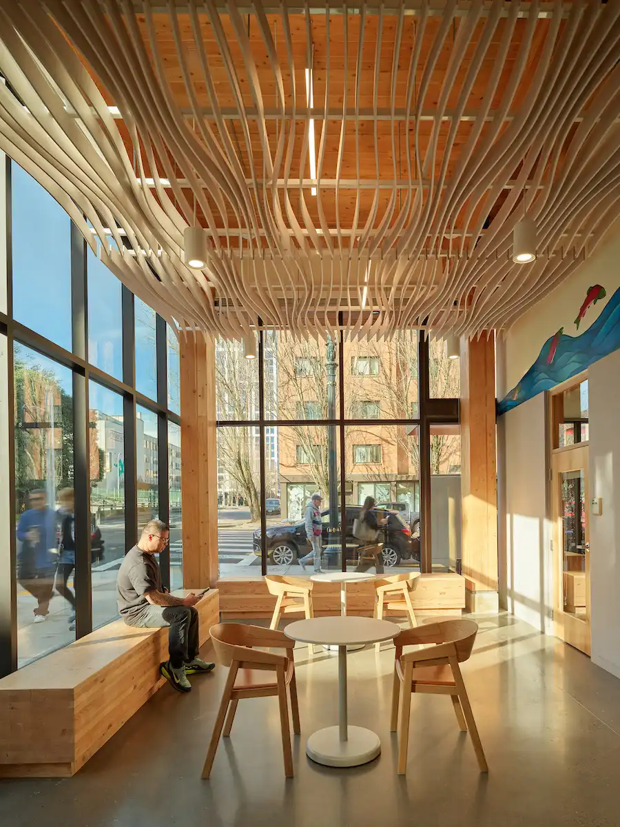 Design highlights like exposed wood ceilings and glulam columns and beams, visible from the exterior through large windows, are key elements of a warm material palette inspired by local ecology of the Pacific Northwest. Communal spaces are expressed on the façade of the building as large carve-outs in its massing. Much like the historic communities who remained connected through traveling the ancient waterways of the Columbia River, these spaces are connected through a single, basalt-like fissure that travels between them and adds a subtle articulation to the façade.