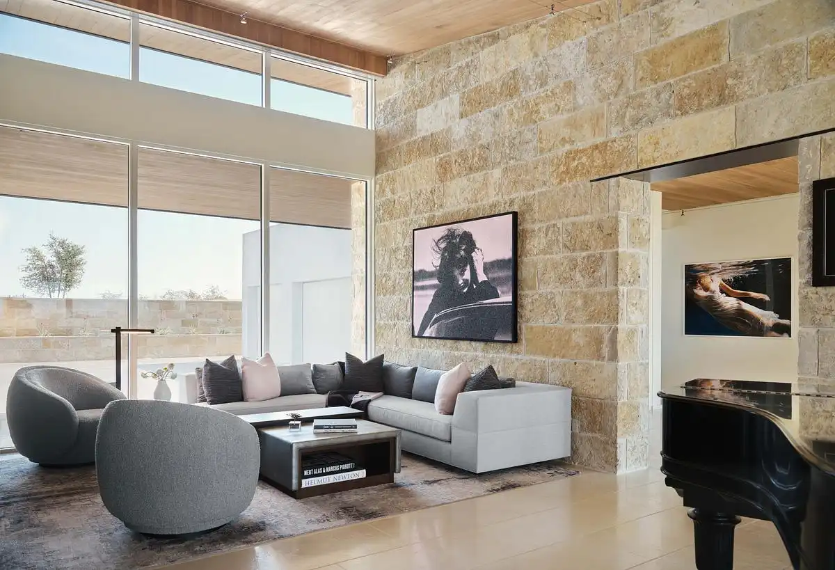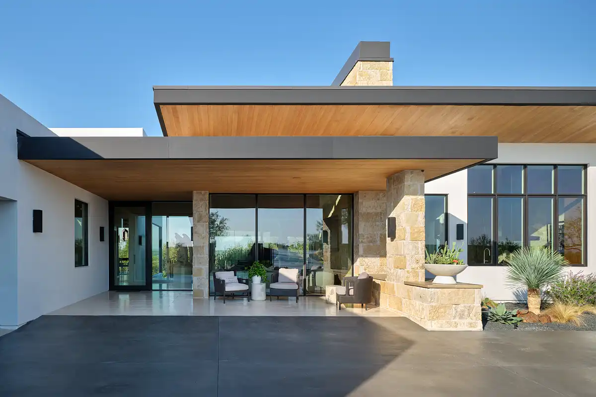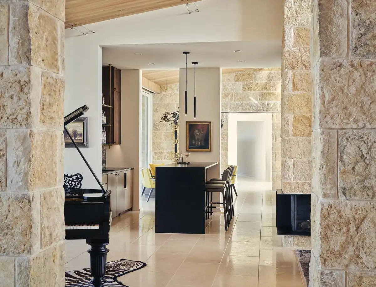 Interiors and exterior spaces flow smoothly, without making the residence feel super-sized. The simple forms are rendered in a Hill Country palette with Texas rough-back Lueders limestone, creating a warmly colored texture for the exterior. Expansive windows create a comfortable transparency and pocket behind the living room bar create an 18-foot opening to the terrace. The shed roof slopes downward, mirroring the topography and creating a 14-foot overhang for the terrace, which allows the west-facing orientation to be used comfortably throughout most of the day.