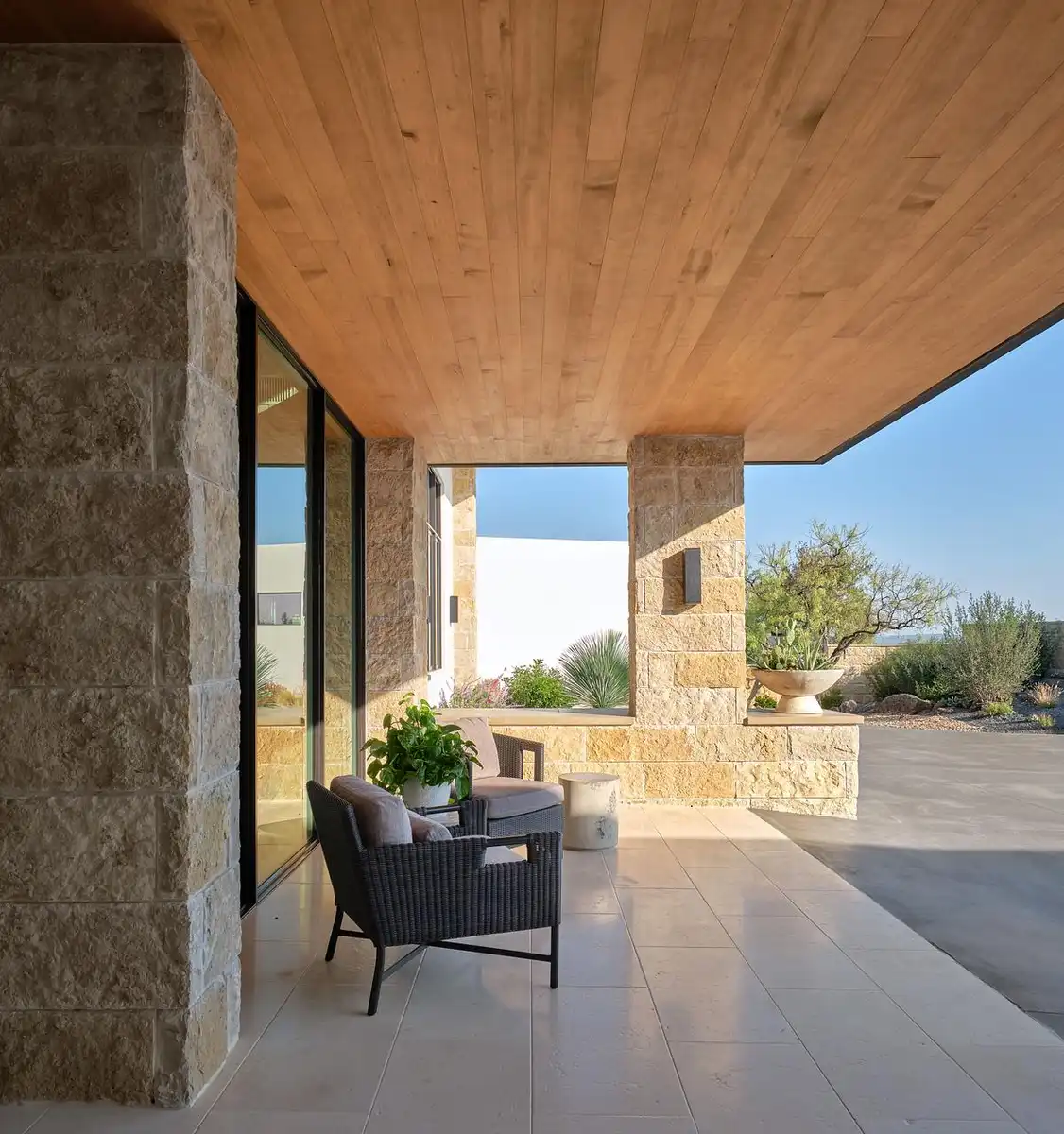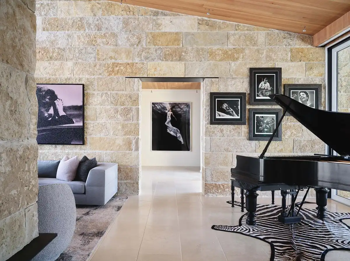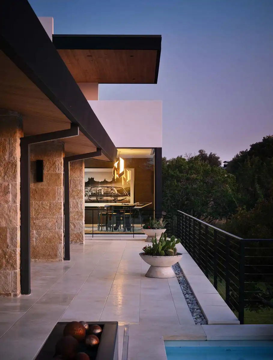 Interiors and exterior spaces flow smoothly, without making the residence feel super-sized. The simple forms are rendered in a Hill Country palette with Texas rough-back Lueders limestone, creating a warmly colored texture for the exterior. Expansive windows create a comfortable transparency and pocket behind the living room bar create an 18-foot opening to the terrace. The shed roof slopes downward, mirroring the topography and creating a 14-foot overhang for the terrace, which allows the west-facing orientation to be used comfortably throughout most of the day.