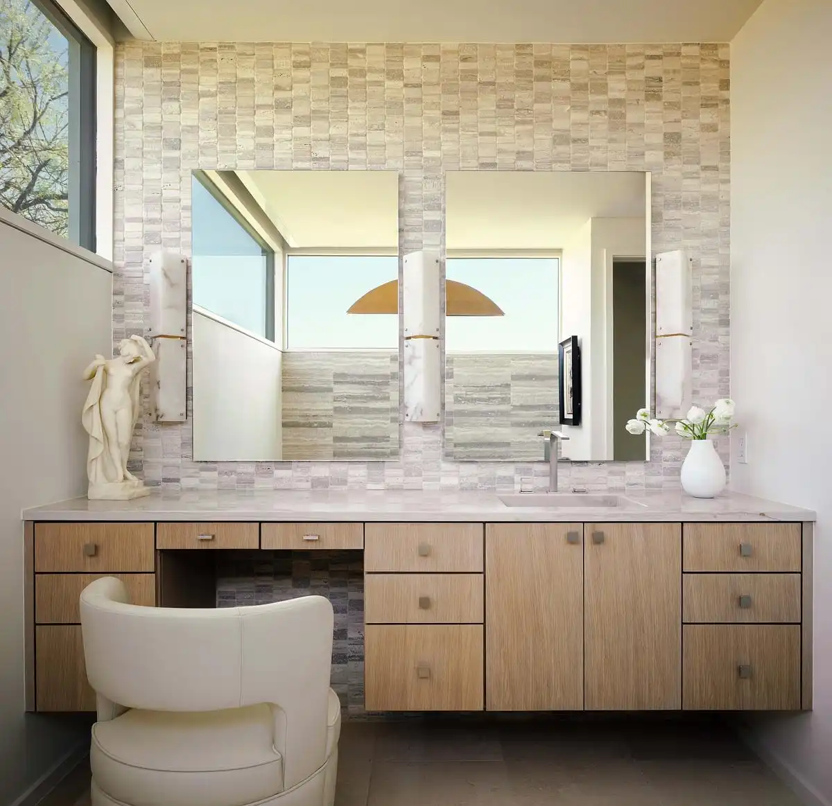 The primary bedroom is a sedate respite space with a custom designed storage unit that doubles as a room divider and headboard, orienting the room towards the terrace, pool, and views beyond. A short hallway leads to the home office, a comfortable lounge and addressing area, his-and-hers closets, and similar baths. These sun-lit spaces convey a sense of privacy with large windows facing the side yard of scrubby Hill Country flora and deer.