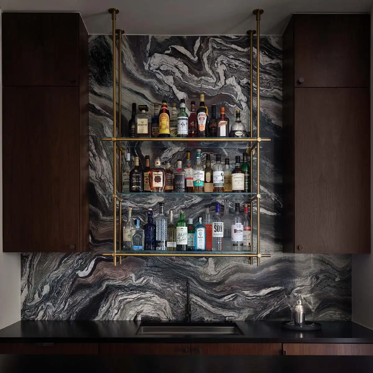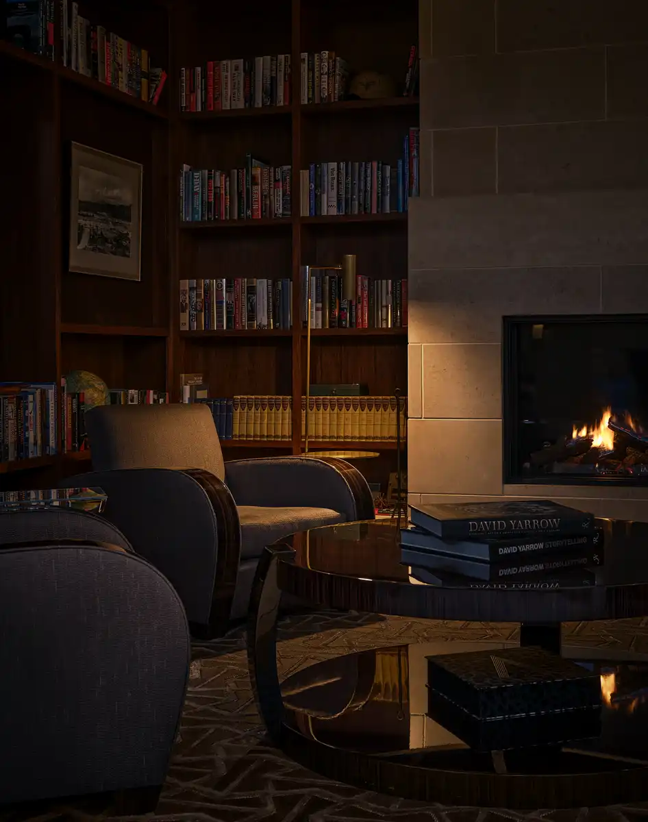 The casino room with regulation size blackjack table – and custom designed chips– floats above the tree canopy and provides a dining nook for late night dinners, an homage to the crazy hours and mealtimes of Steve’s days in medical school. The library, by contrast, is a secluded retreat that opens to a private patio, bookended by indoor and outdoor fireplaces.