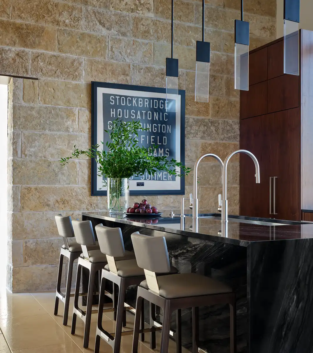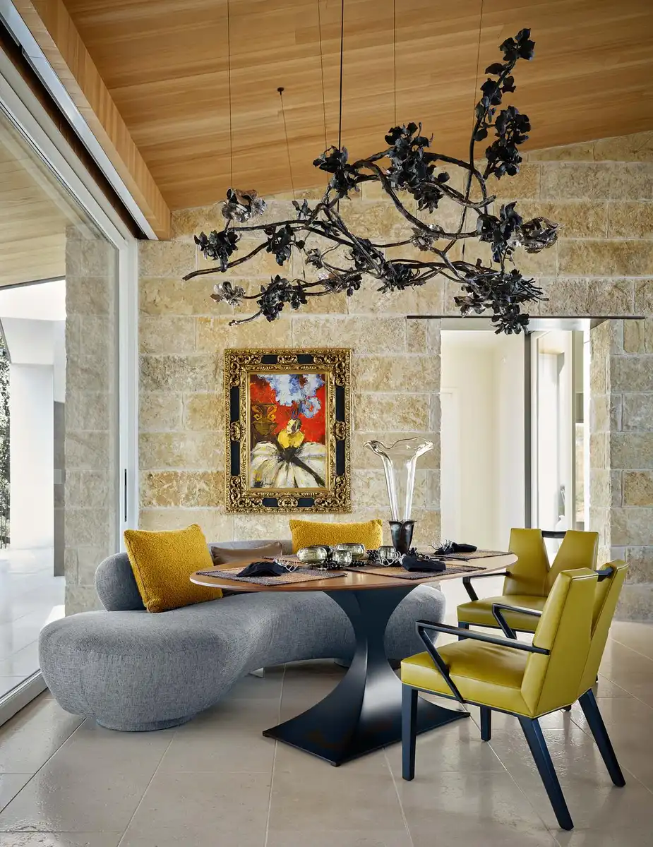 A large table underneath a custom metalwork chandelier evokes branches of a tree canopy, a reminder of the connection to nature. The galley sink system in the kitchen creates efficiencies in food preparation and additional counter space for easy buffet service, further reinforcing the sense of informal hospitality.