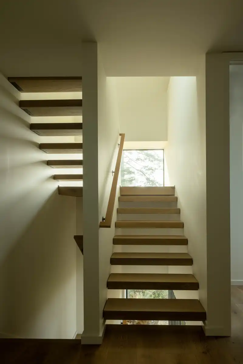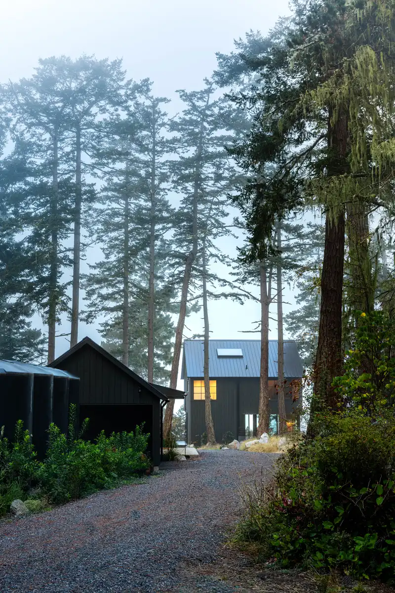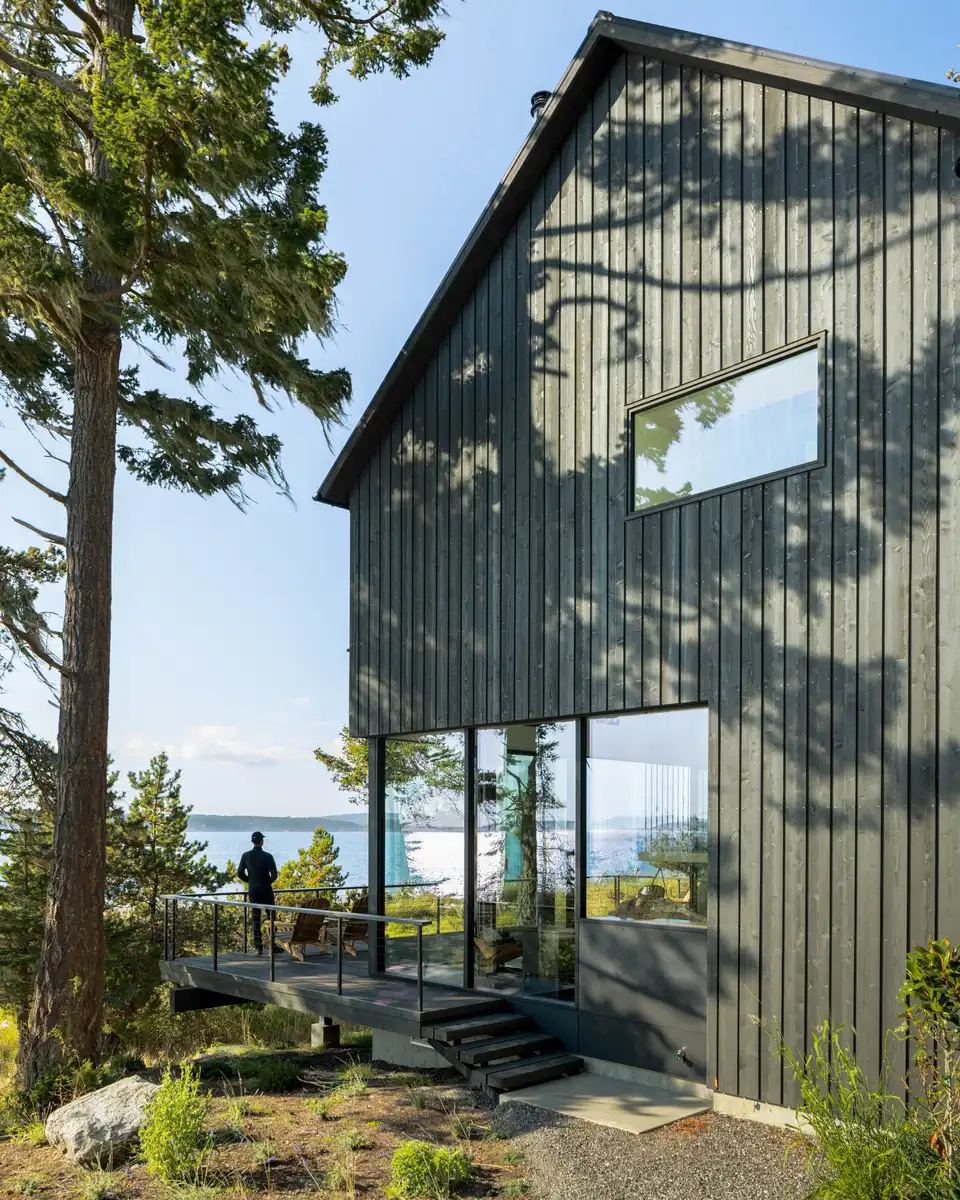 The three floors are connected by an open stair capped by a large skylight, which pours light into levels below. The house is clad in black in deference to its surroundings, ensuring that the home remains nearly invisible from the public shoreline.