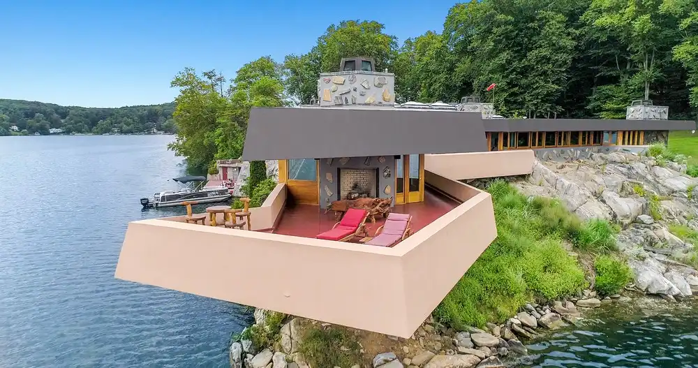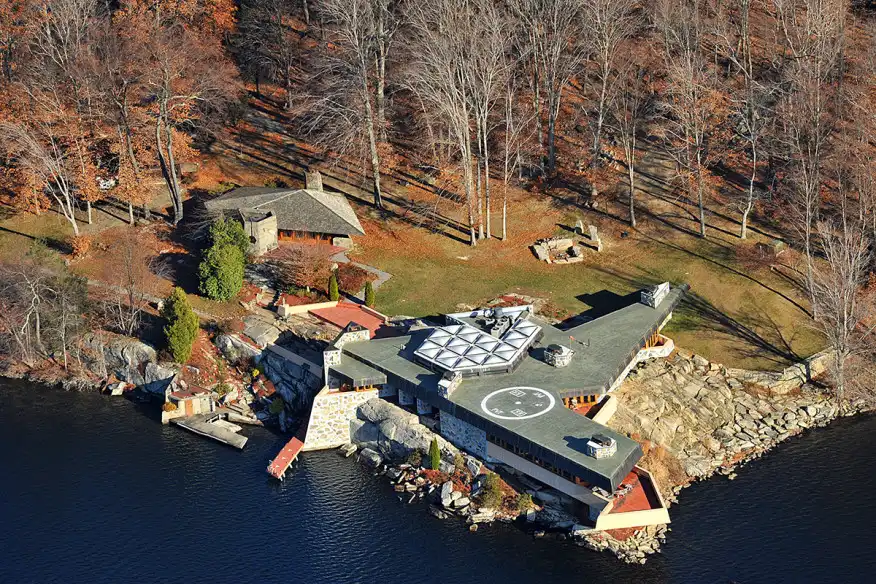 Roughly 50 miles north of New York City in the middle of Lake Mahopac on its own island, there is a stunning house cantilevered over the water that has had its share of controversy over whether or not it was designed by Frank Lloyd Wright.