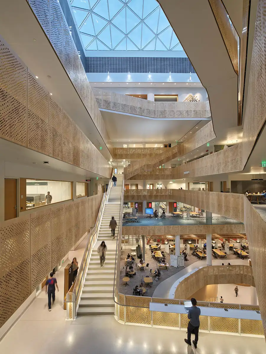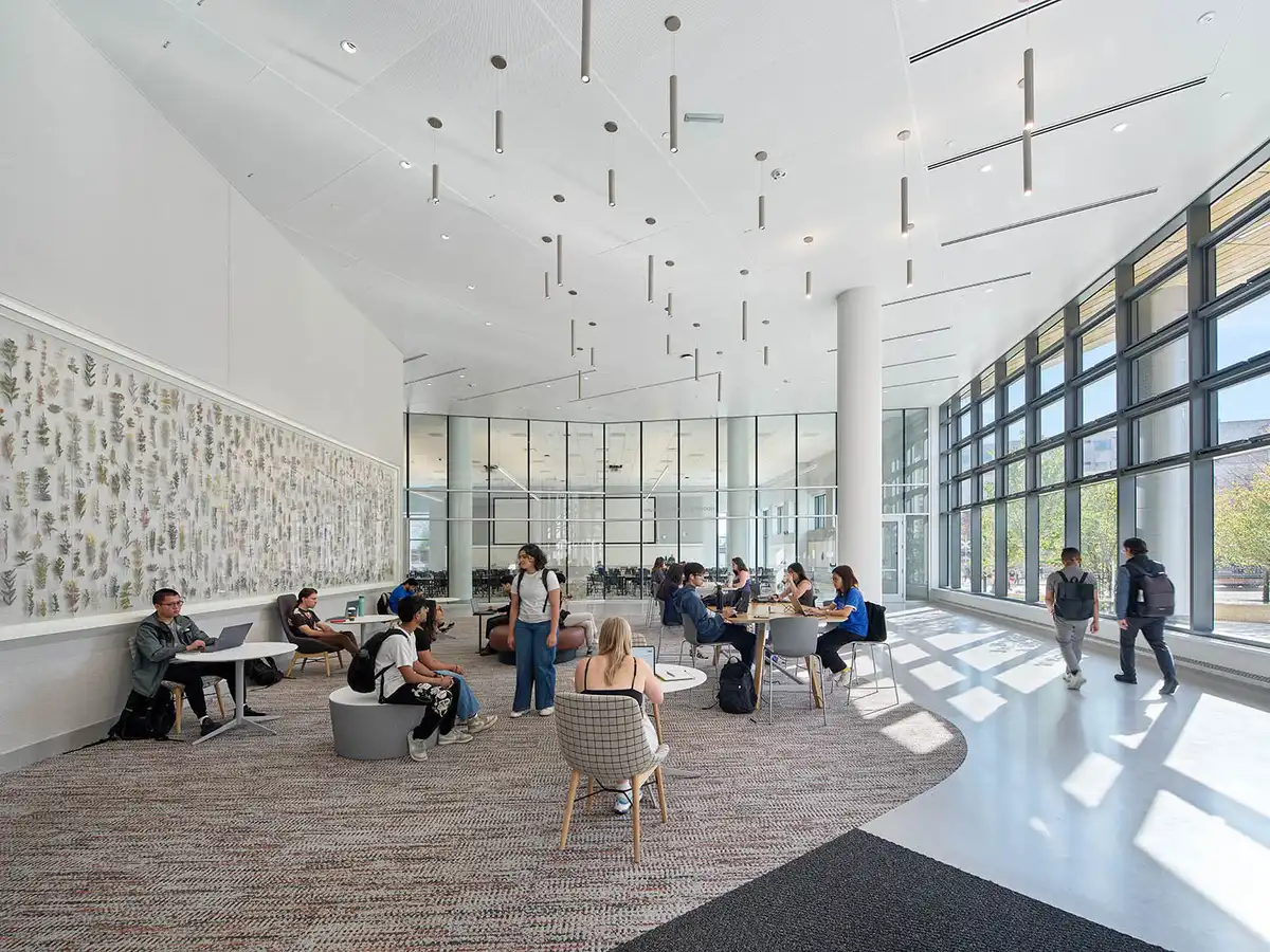 Biophilic design principles are woven throughout, with indoor gardens, green walls, and exterior terraces that integrate nature into the user experience. The building is targeting a 63% reduction in energy use compared to the 2030 baseline, setting a new benchmark for campus sustainability.