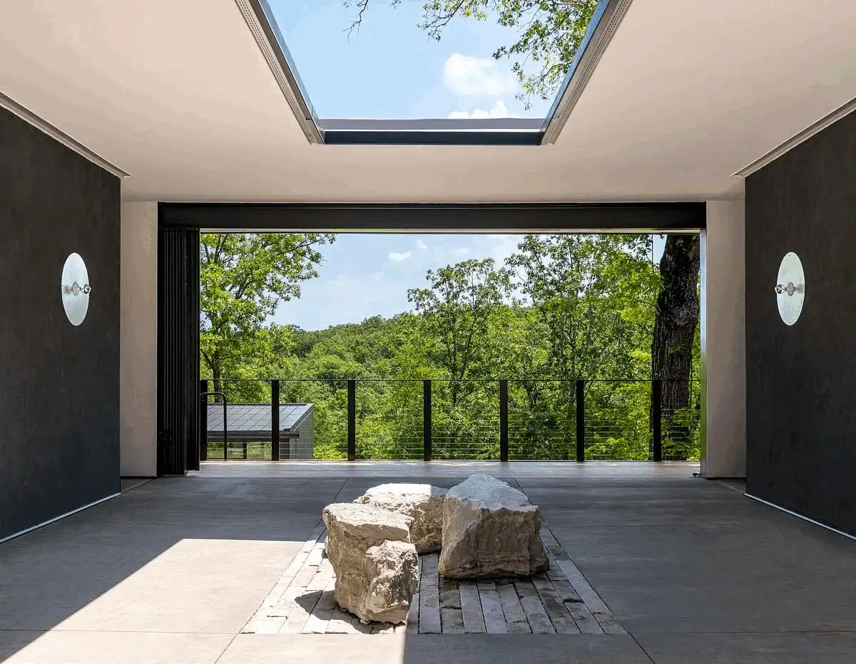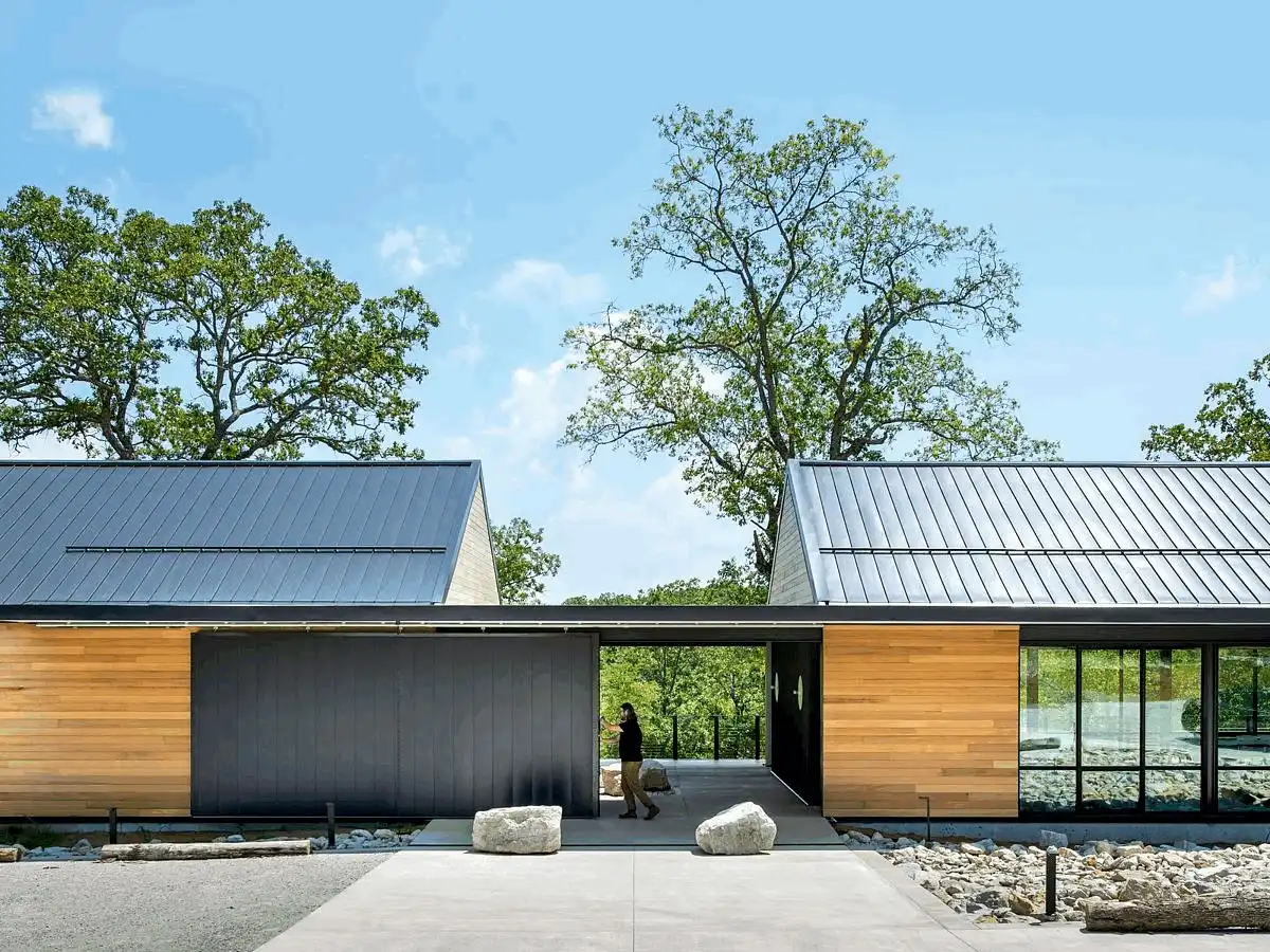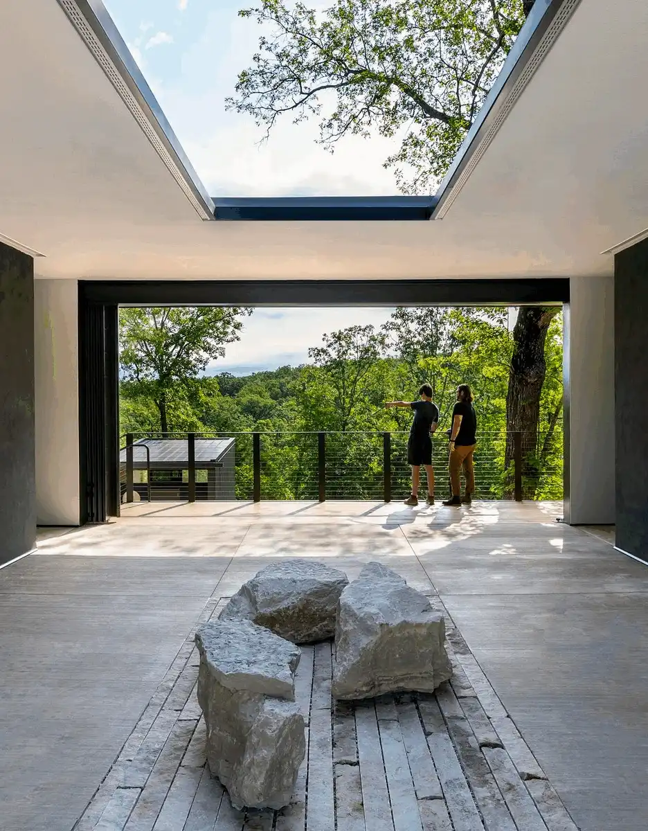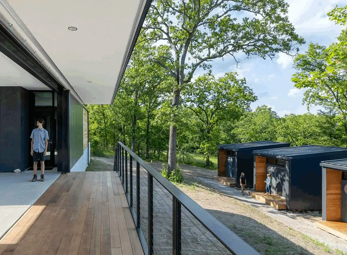 The facility is divided up into community space and residential space by way of an entry dogtrot, which serves as a focal point for visitors to the MSU Ozarks Education Center. Large barn doors framing views from the east and west and a roof oculus naturally orient visitors to time of day and create a connection to sky and earth.