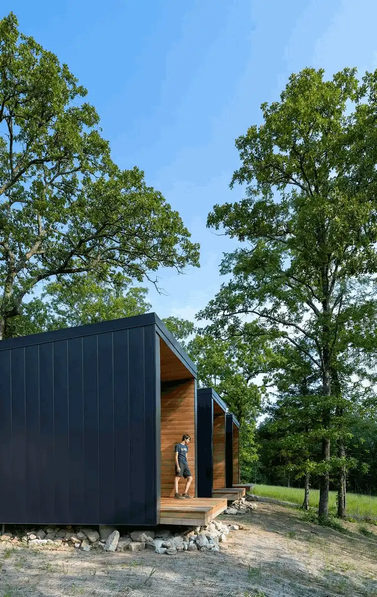 The cabins employ passive cooling strategies with low operable windows on the west and high clerestory operable windows on the east that encourage natural cooling via wind.