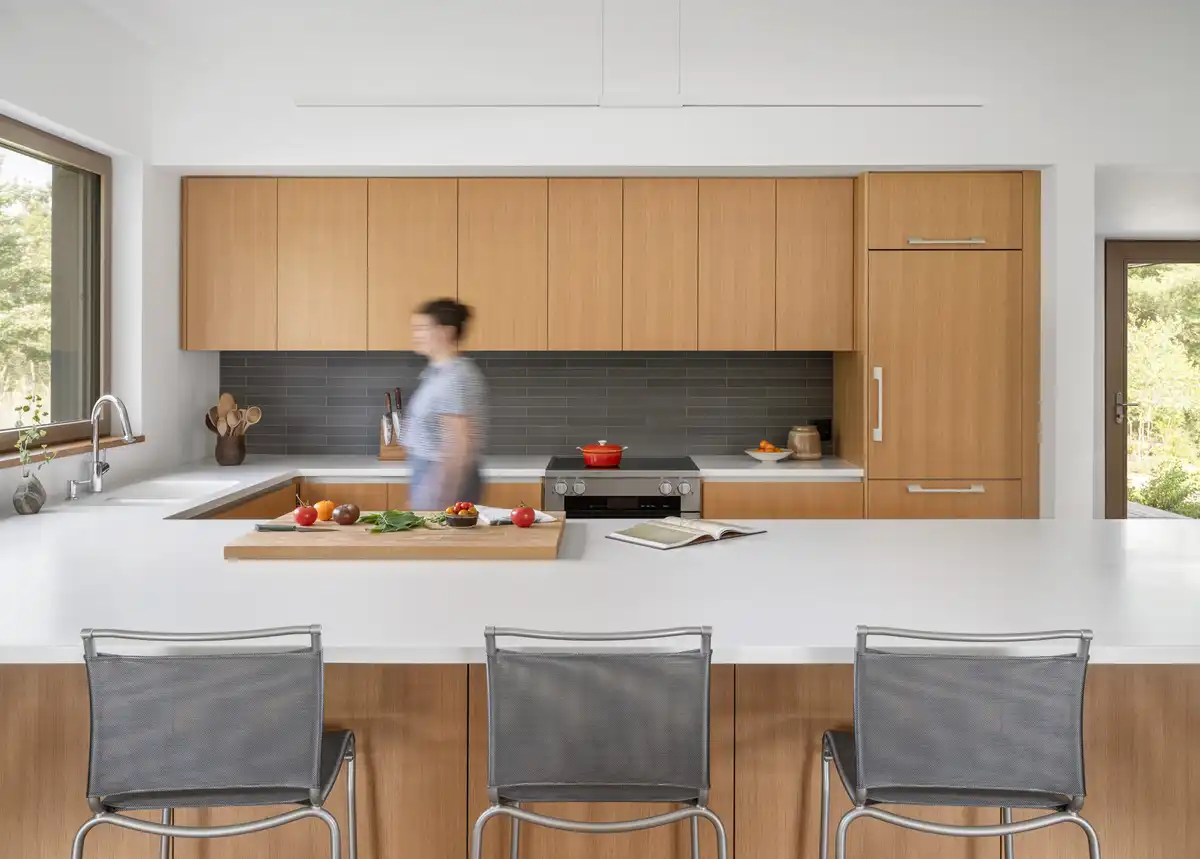 The owners are accomplished woodworkers, and an important aspect of the design brief was to create an accessible home that provides an interior connection between the primary living spaces and a workshop and storage area for year-round projects.