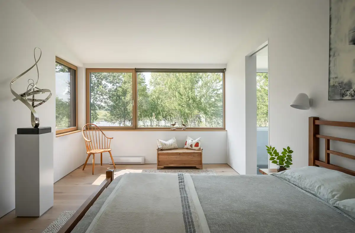 The home is built with a Passive House approach to the building shell with high levels of biogenic insulation, air-sealing, triple-glazed European windows and doors, and heat recovery ventilation.