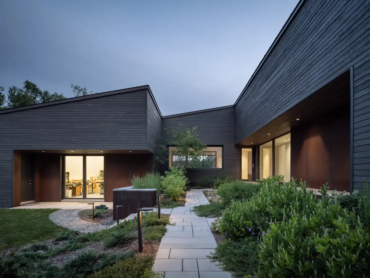 The 3,790-square-foot home was designed to knit together the different functional areas of the home — garage, living, and workshop—into a single, efficient articulated building form rather than a series of separate volumes.