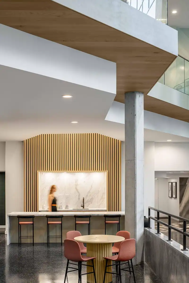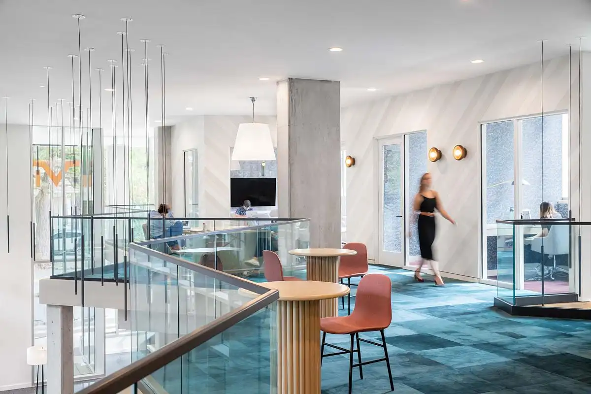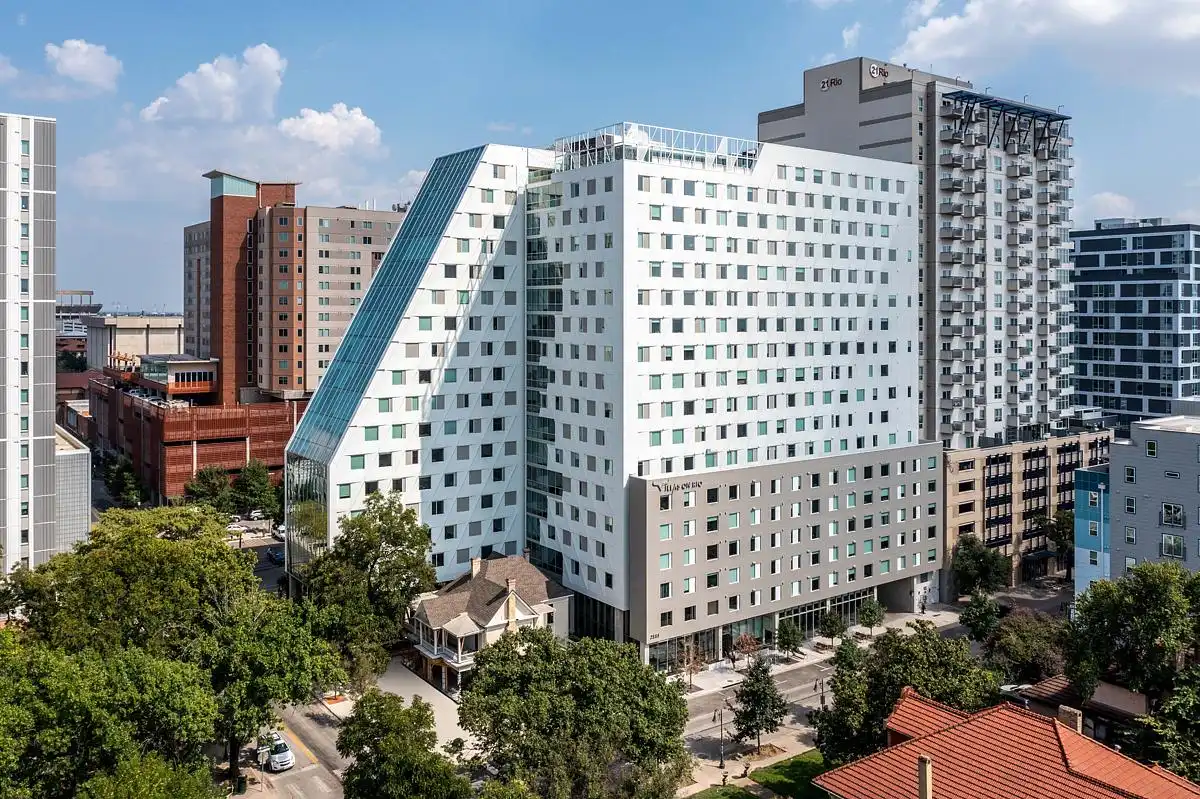 Villas on Rio, a 284-unit student housing high-rise in the heart of the University of Texas at Austin’s West Campus neighborhood, opened in 2021 and spans 19 floors. The first and second floors serve as flexible study and lounge areas with a mezzanine overlooking the lobby.