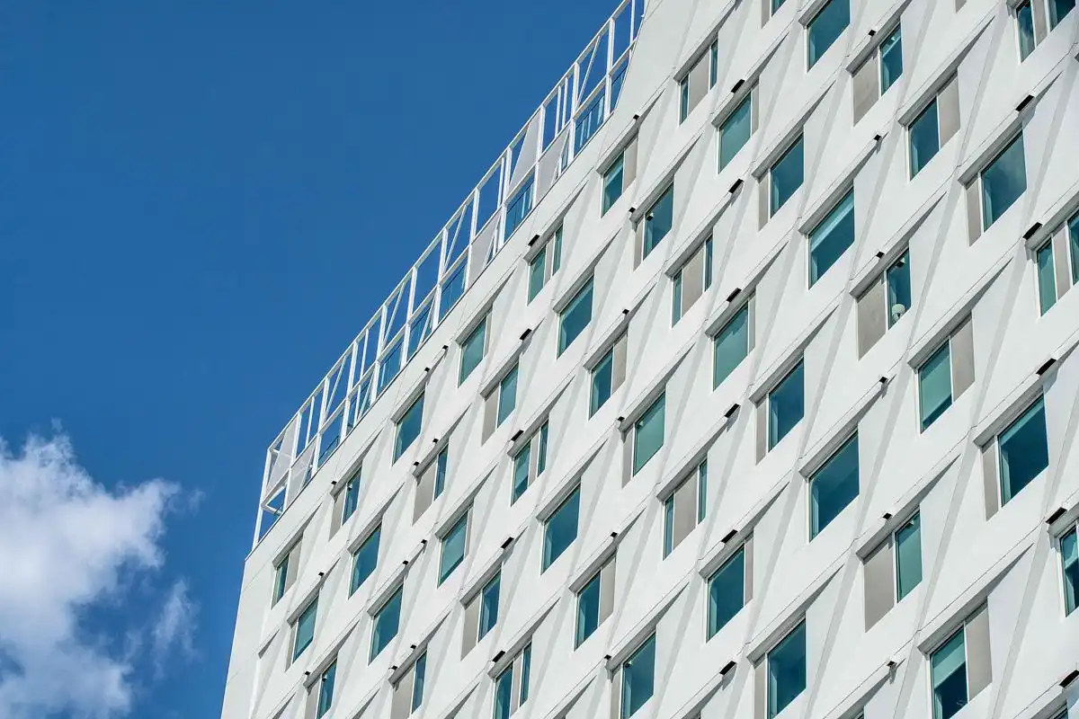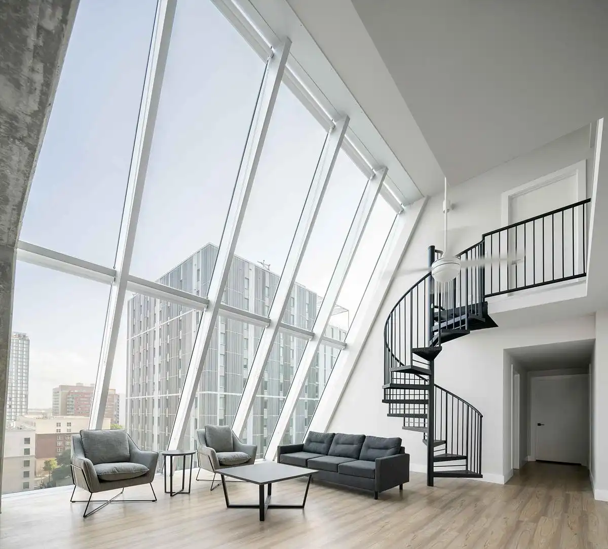 A dramatic, angled curtain wall is incorporated into the tower’s north side, responding to the 62-degree required setback plane. On the façade, the exterior custom-formed, faceted panels reference this setback plane, sparking an angular language continued throughout the tower’s interior architecture.