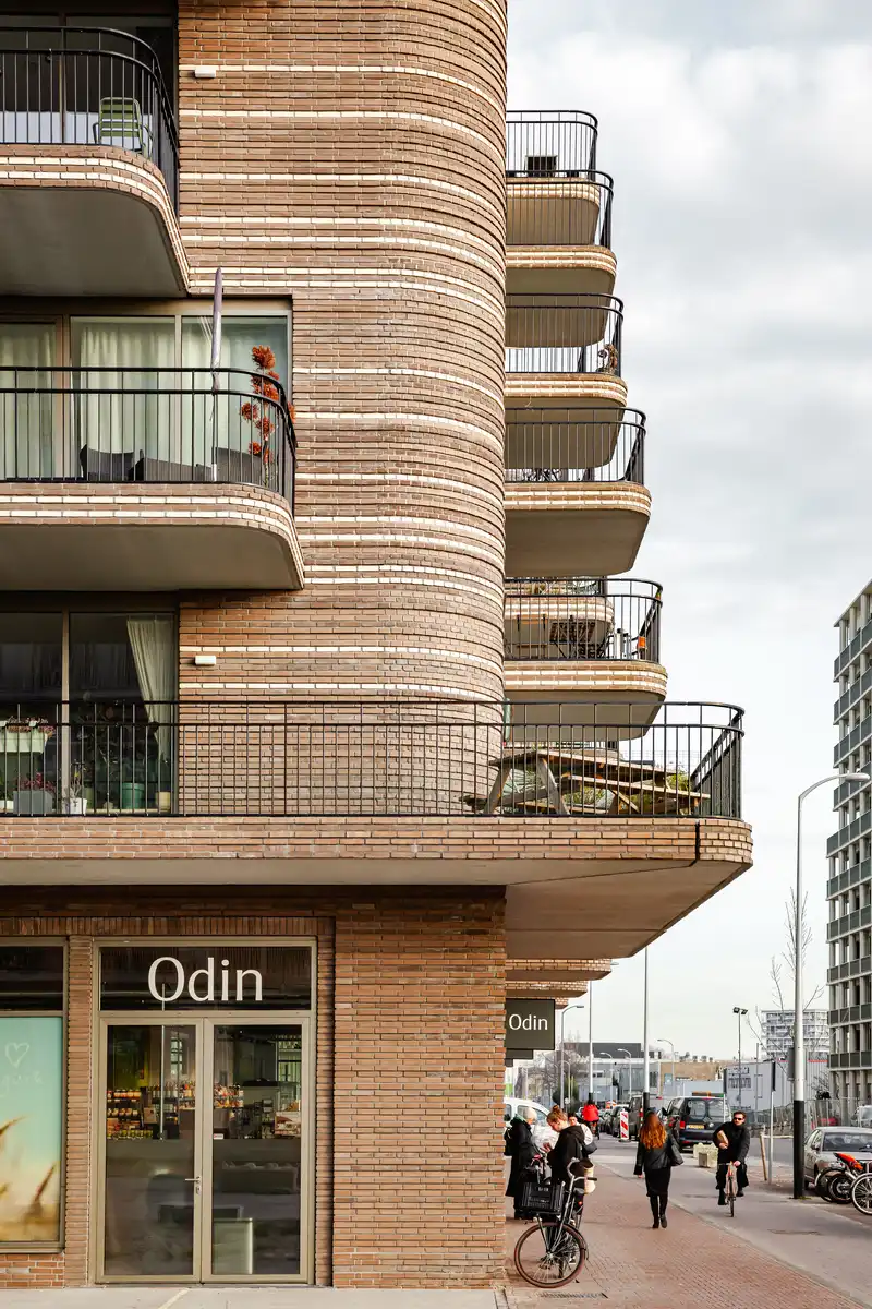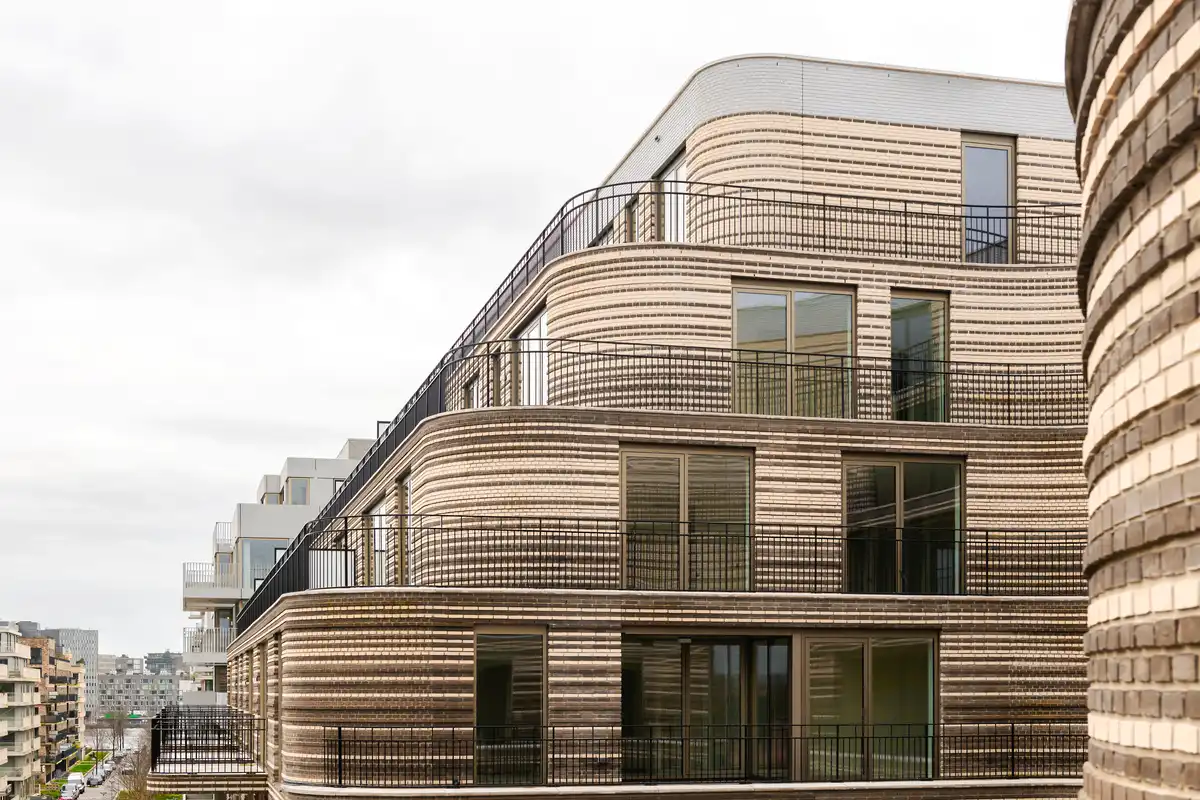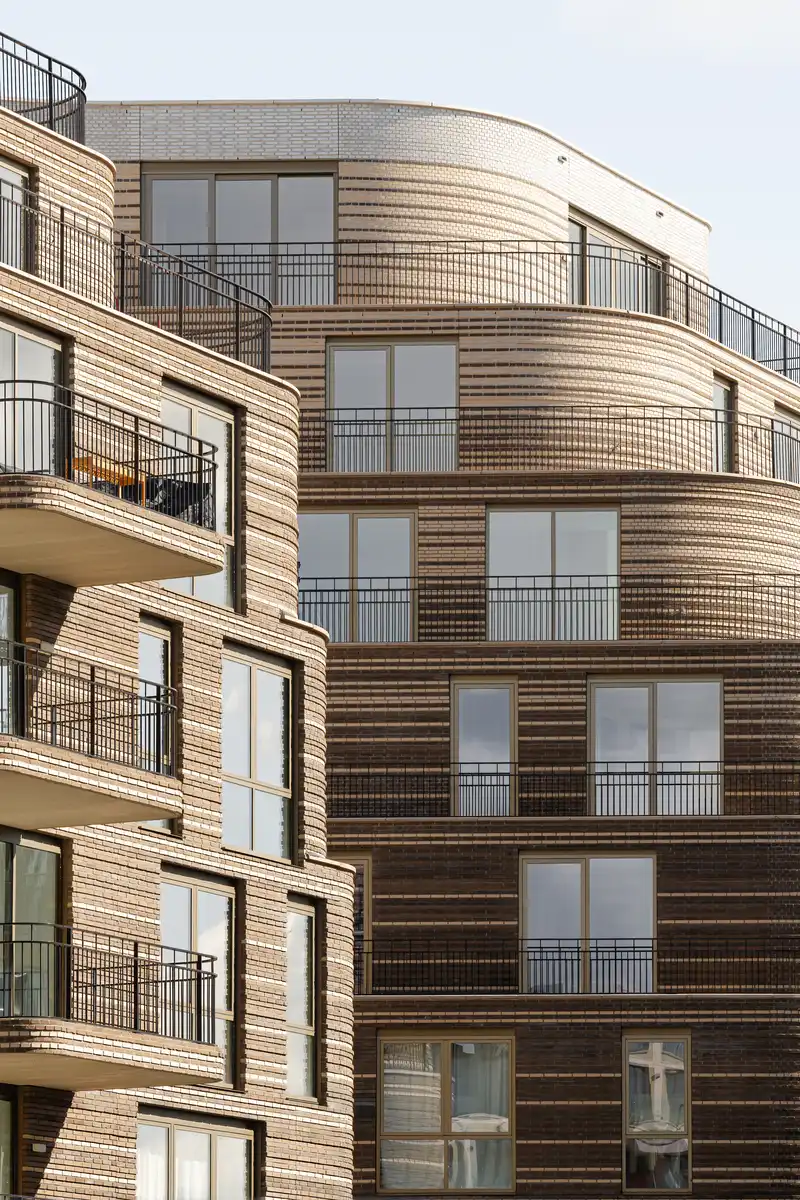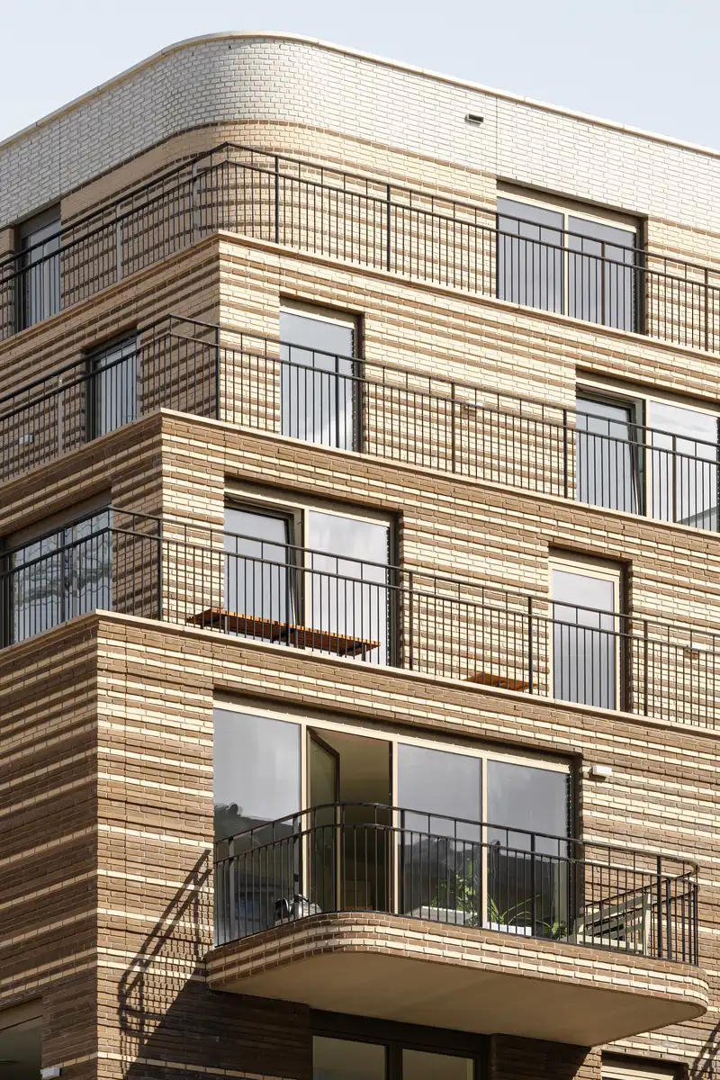 The Bow exudes a crafted character through its refined and distinctive brick façades. These façades not only feature relief textures but also transition in color from top to bottom. A palette of four brick tones is used—gradually shifting from gray-brown at the ground level, through cappuccino, to glossy white at the penthouse level. Balconies and balustrades further enhance the metropolitan character of the building, introducing long horizontal lines that add a layer of ornamentation.