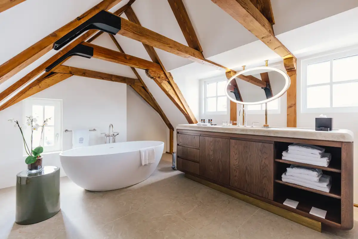 In May 2024, the Serendipity building—an annex originally added in 2014—underwent a complete renovation. Originally designed by Dutch interior architect Remy Meijers, known for his serene, nature-inspired spaces, the interiors were thoughtfully updated by Studio Linse with ornamental moldings, warmer tones, and soft carpets. Format Furniture crafted custom vanities, mirrors, and lighting for each bathroom. From the luxury category upwards, all rooms now feature freestanding Vallone bathtubs.