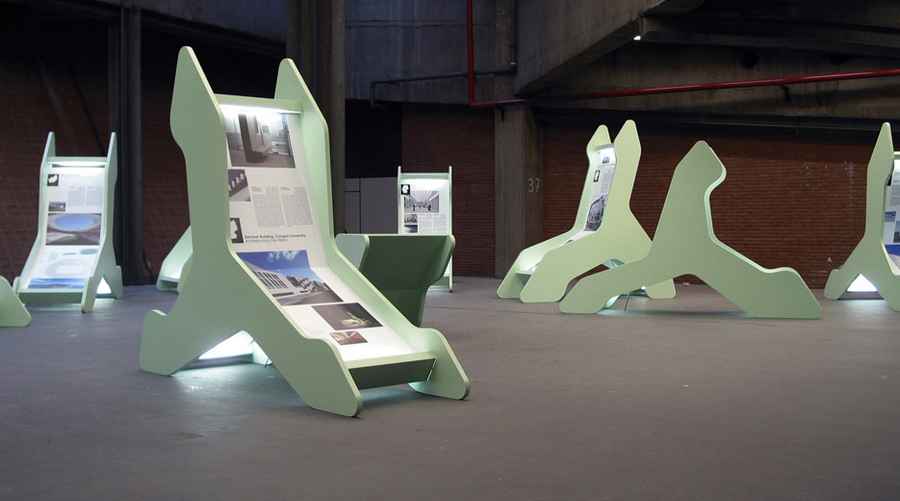 “Die von J. MAYER H. entworfene Ausstellungsarchitektur untersucht das Thema Architekturpräsentation auf neuartige Weise. Die mobilen und wandelbaren Ausstellungsskulpturen stehen miteinander in einem spannenden Dialog. Die Skulpturen integrieren dabei Präsentationen von verschiedenen Arbeiten ausgewählter Architekten und Ingenieure.