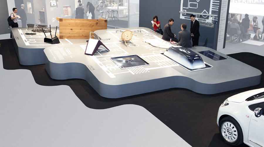 “Products that are “made in Germany” and high-quality German workmanship are famous the world over as great export items. The presentation at German Design Loft hinges on the idea of highlighting the quality of these exhibits by focusing on the details of the finishing. For example, the objects lie on their sides or the wrong way up – on raised pedestals, printed with inverted graphics of building ground plans, enlarged to a scale of about 1-in-2.