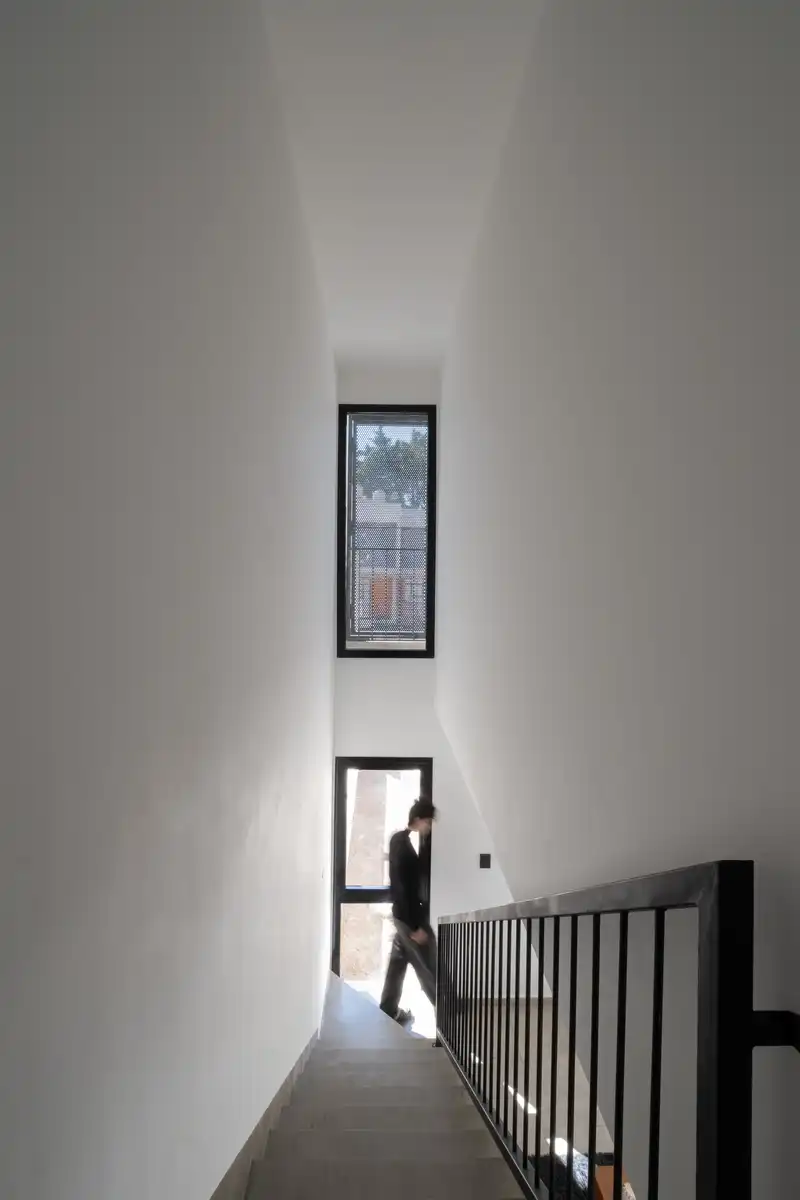 The staircase follows the same framework as the carpentry, a criterion also reflected in the design of the flooring, which creates a strip of greenery intended to incorporate vegetation in the front. Thanks to this logic, the staircase receives natural light from both the lower and upper levels, bathing it in light at different times of the morning and reinforcing the spatial quality of the vertical core and living room.