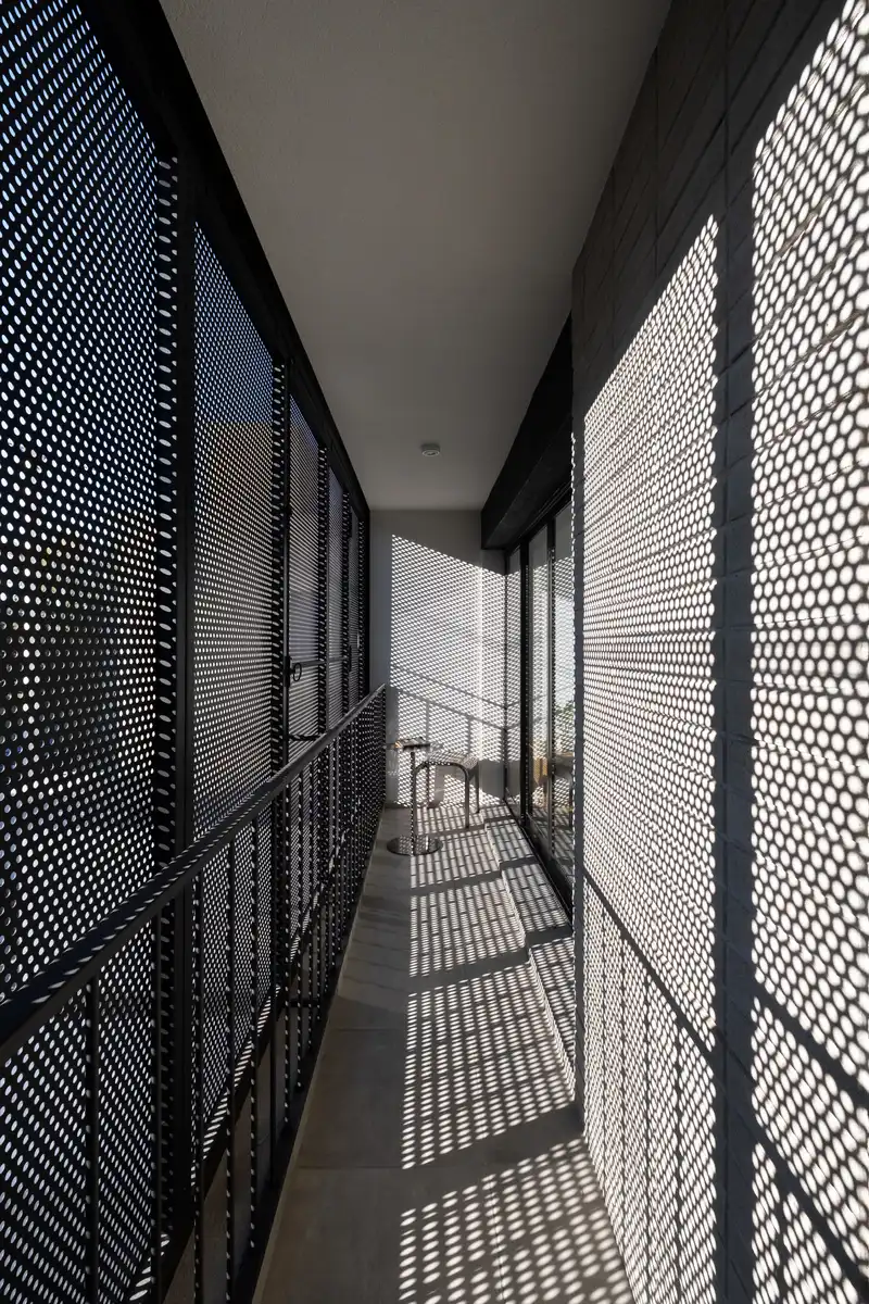The project’s objective is to combine functionality, flexibility, and climate comfort based on clear design decisions. The east-facing façade incorporates folding panels of perforated sheet metal that, in addition to defining the character of the complex, allow for the regulation of sunlight and privacy according to the living habits of each user.
