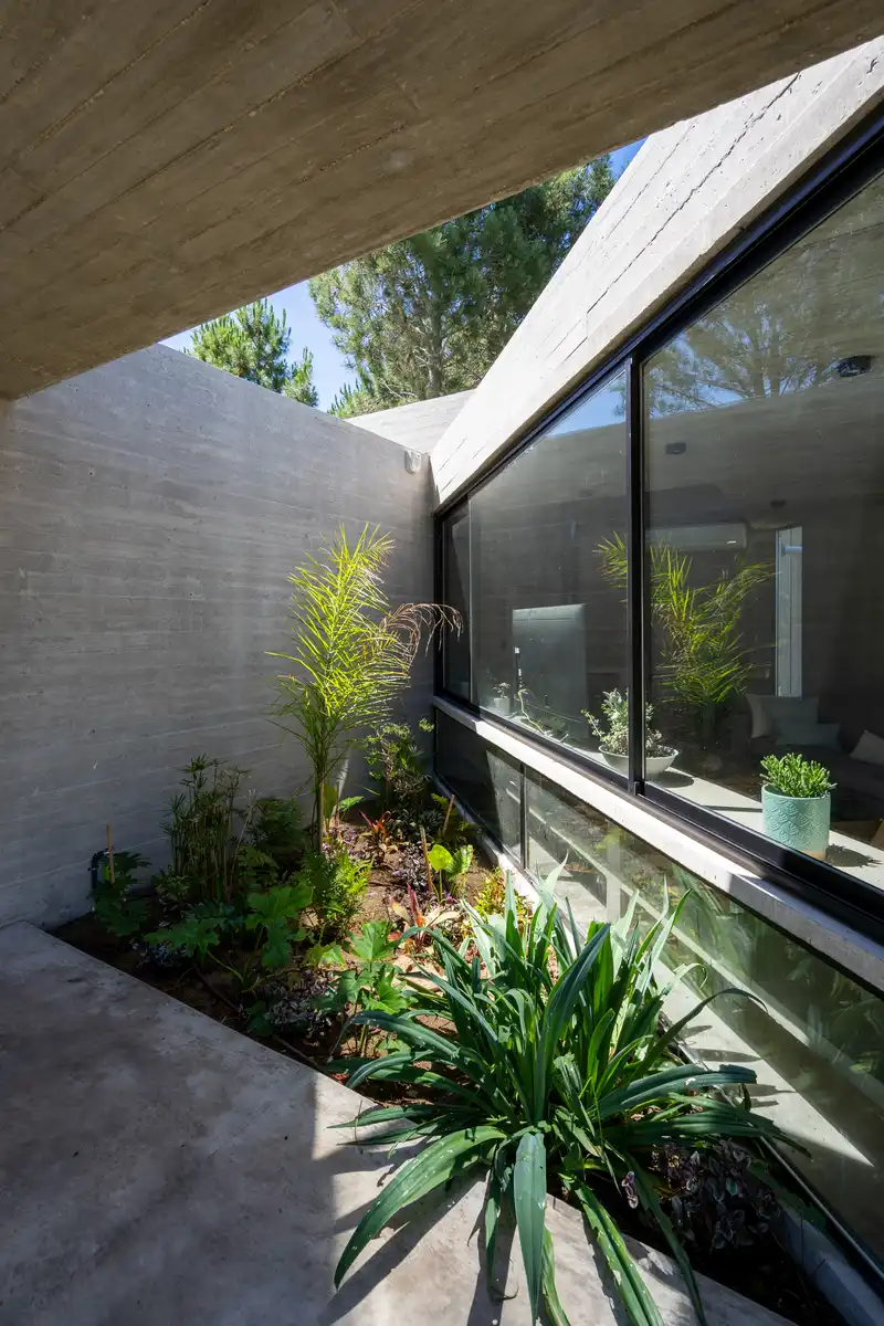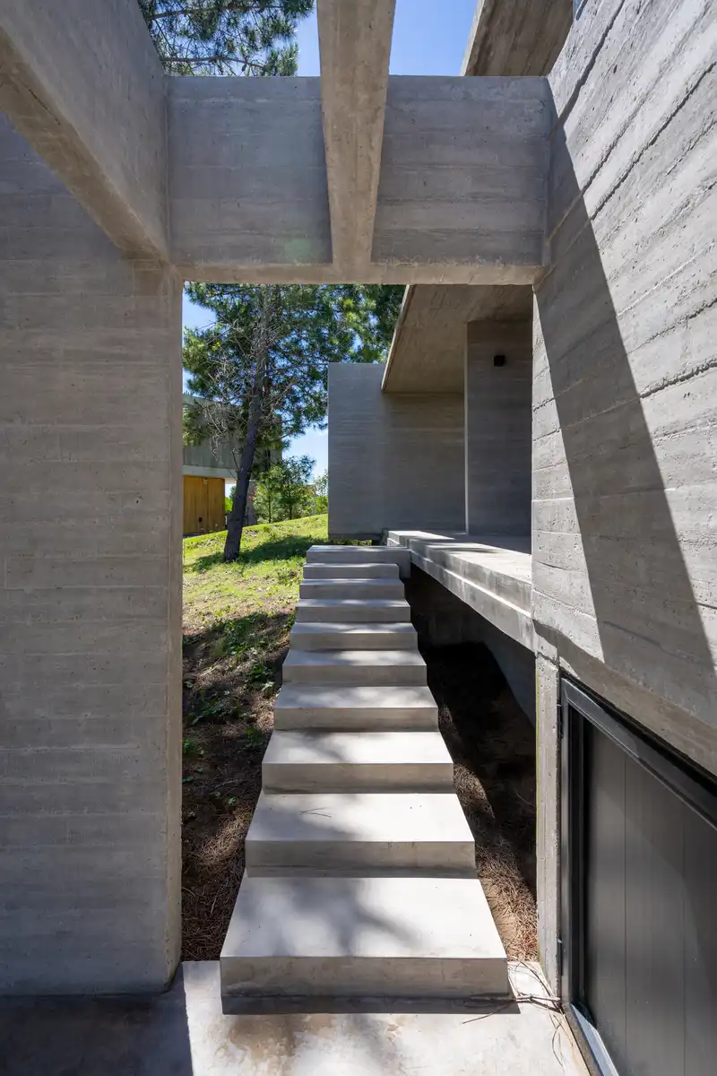 In our studio, we conceive of natural light not only as a functional requirement, but as a design material that adds spatial richness. The openings are not standardized elements, but strategic perforations that blur the boundary between interior and exterior. In Senderos House, the interplay of perforations, concrete pergolas, and skylights creates changing atmospheres that frame the forest and add dynamism to each environment.