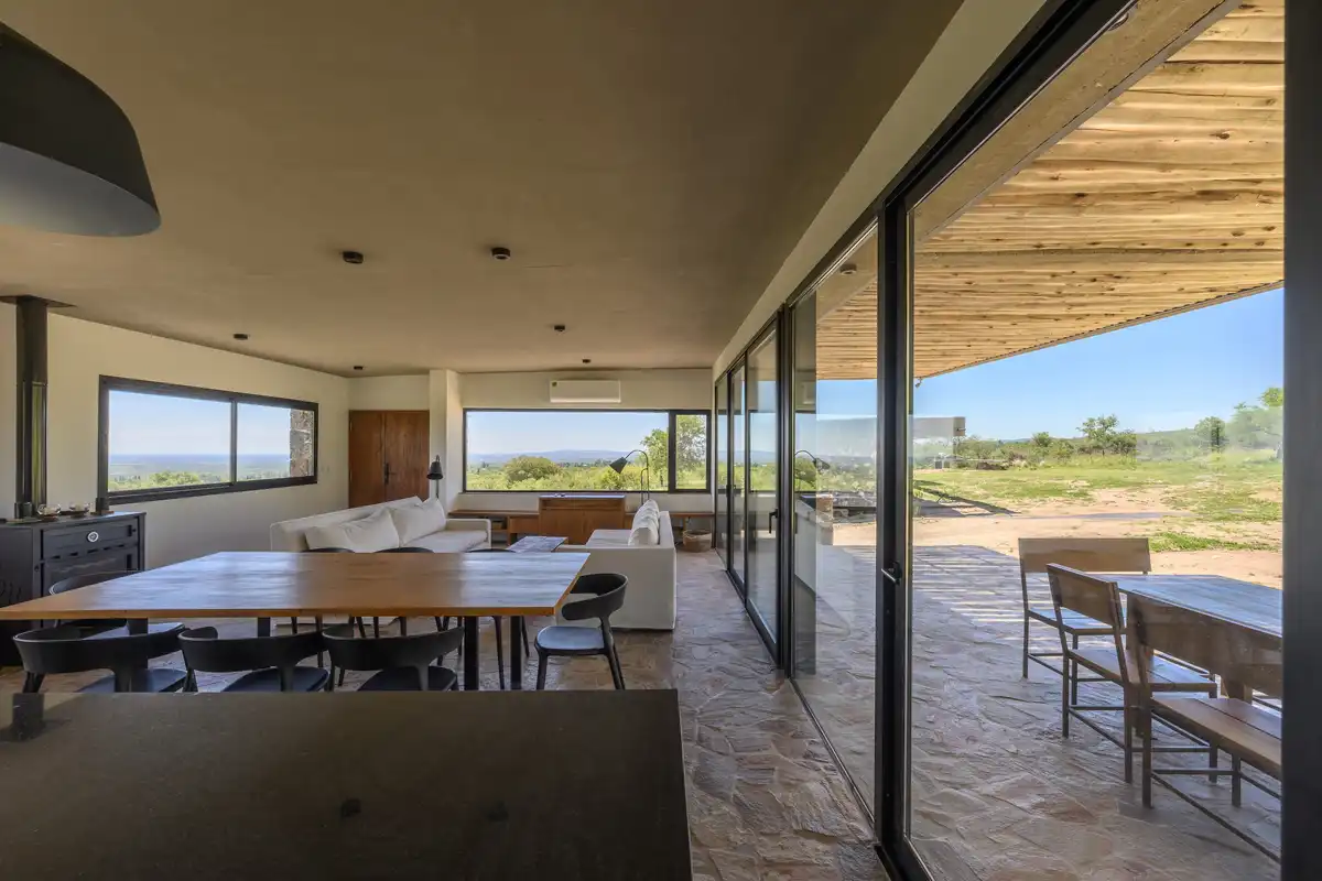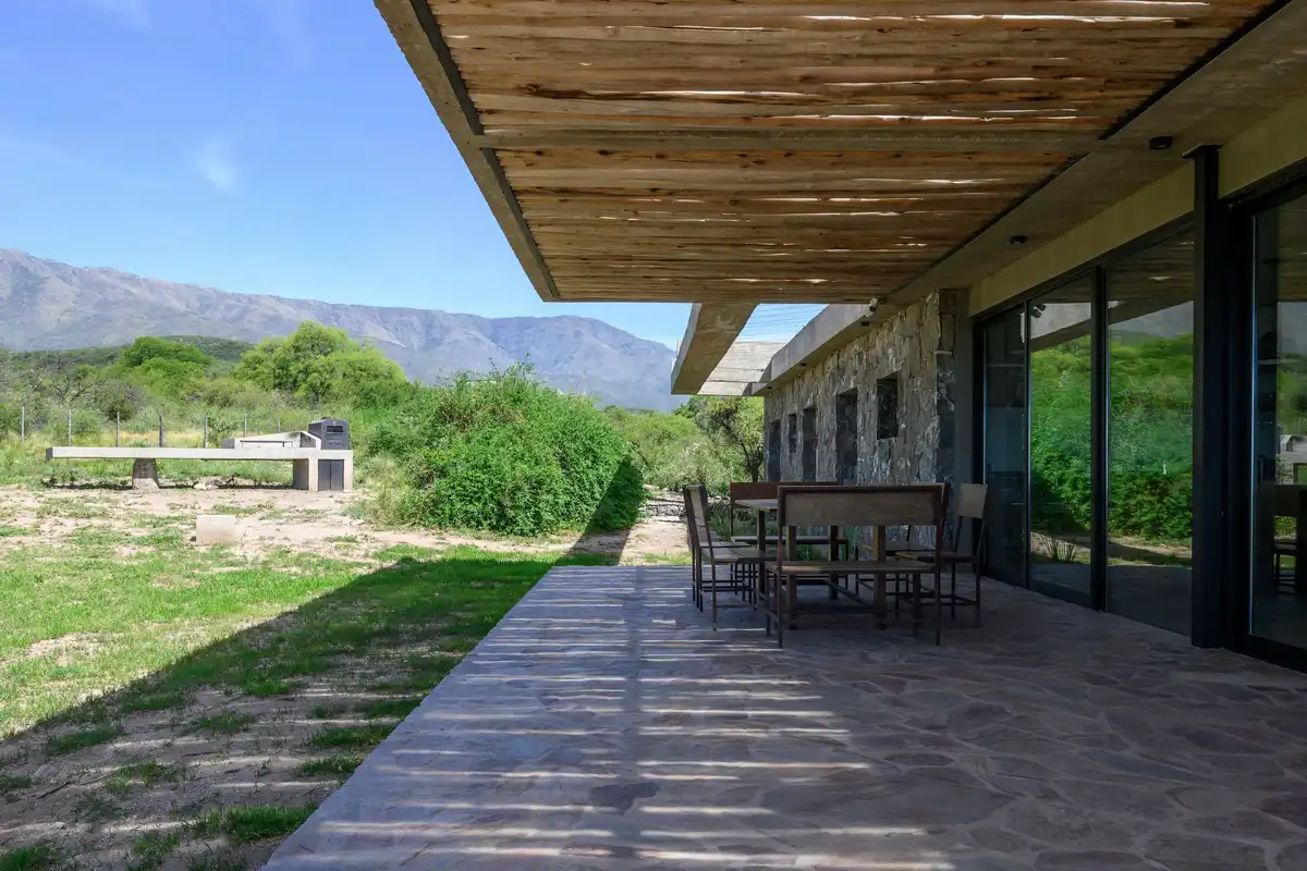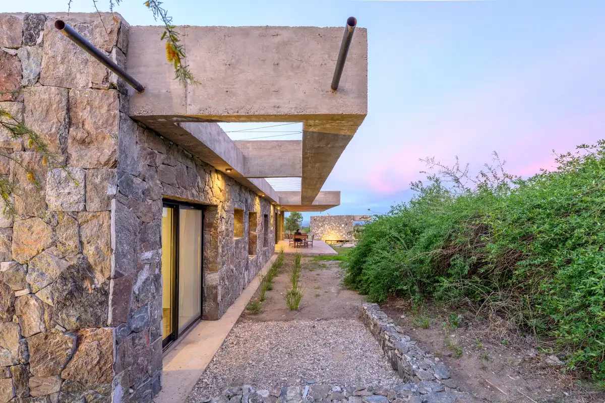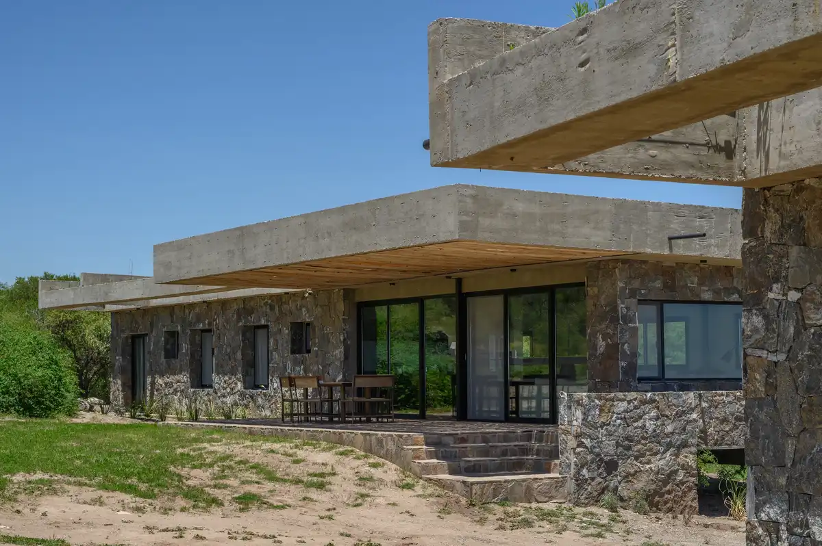 The structural system also defines the spatial organization. A series of beams arranged perpendicular to the longitudinal direction of the slabs allows for a wide, column-free gallery fully open to the landscape. The main slab is slightly inclined toward the west, reducing direct solar exposure and facilitating rainwater drainage, while increasing the height toward the eastern façade to reinforce the visual framing of the mountain range where Cerro Champaquí rises.In the bedroom area, this logic is expressed through a lightweight structural pergola, composed of two U-shaped beams that function as elevated planters for deciduous climbing vegetation. This element provides seasonal shading without obstructing views, reinforcing the idea of suspended planes that characterize the eastern expansion.