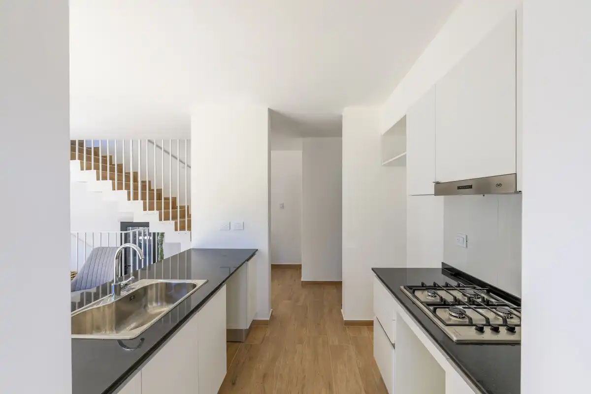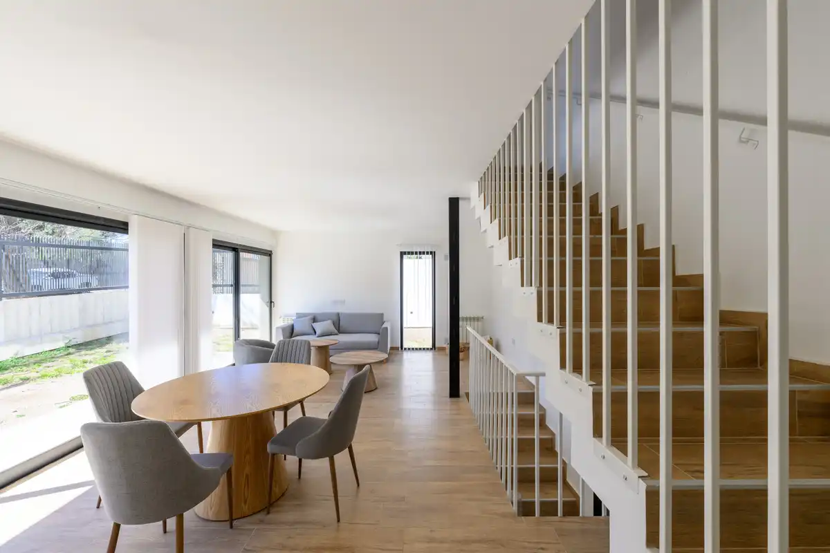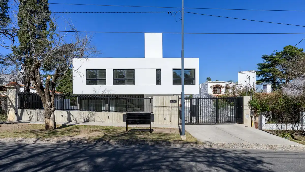 All painted white. Following that concept, we opted for white walls above, so as not to obstruct the overall view of the neighborhood at first glance. Below, volumes with soft, gray textures create contrast.