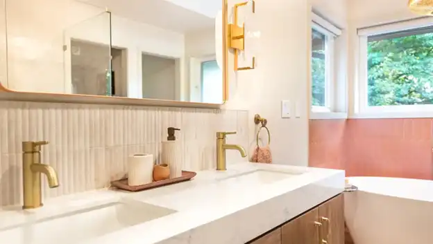 Black faucets and hardware are giving way to warmer metals. Polished nickel, aged unlacquered brass, and champagne bronze bring lighter, more refined touches that feel classic rather than trendy. These finishes ensure longevity in design while adding sophisticated visual warmth.