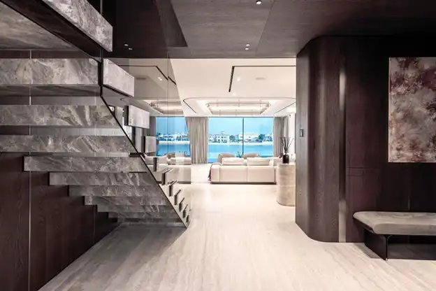 Wellbeing shapes both planning and detailing. Spa-style bathrooms, personal gyms and calm corners support recovery after long days. Daylight is moderated through screens and sheers to reduce glare while preserving brightness. Layouts separate focused work from social zones, helping households switch off. Acoustic treatment, softer textures and warm-white lighting support rest in bedrooms and family spaces.