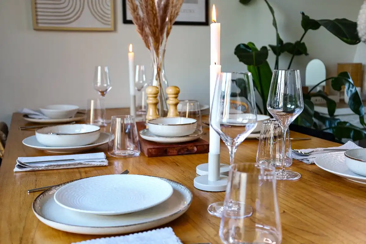 To really bring out the vibe, people paint the walls in colors like terracotta, clay, warm beige, soft olive, or a toned-down sandy shade. In the Natural look, your tableware should feel natural—showing off eco vibes and simplicity. Skip the shiny, fancy stuff or loud, fake colors. Choose dinnerware in tones that complement your walls and décor, ideally with textured finishes rather than glossy ones. For glassware, opt for elegant recycled glass—either clear or softly tinted in green, amber, or smoky hues. Brands that fit this style: