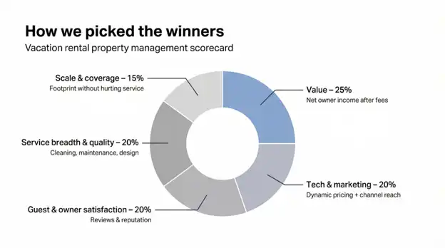 Weighting value highest keeps the spotlight on what matters: your take-home cash, not vanity metrics such as gross bookings. Technology and marketing follow because pricing engines and wide distribution—think dynamic-pricing software from vacation-rental franchise networks like Skyrun—fill calendars that great photos alone can’t. Satisfaction and service quality ensure promises translate into happy guests and owners, while scale verifies the company can replicate success beyond one ZIP code.