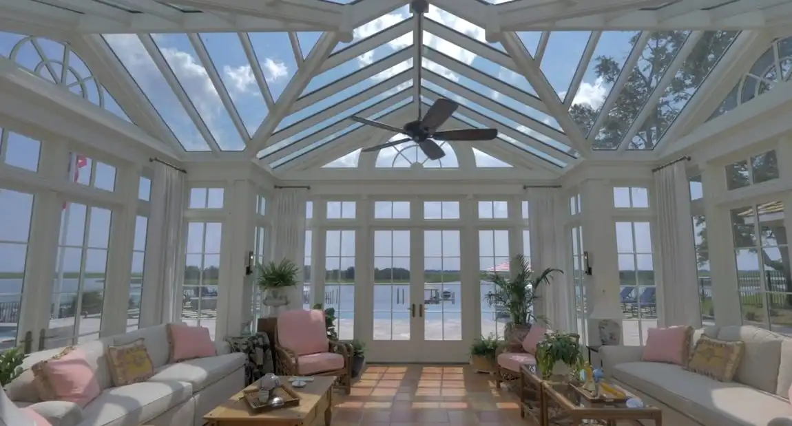 Step through the doors, and the home reveals a series of luminous, well-proportioned spaces. Towering ceilings and expansive windows blur the line between indoors and out, capturing both sunrise and sunset over the water. One of the home’s most captivating features is the glass-ceilinged sunroom—a modern conservatory where daylight pours in from every angle. Whether enjoying morning coffee, evening cocktails, or quiet reflection, it offers a year-round retreat immersed in light and views.