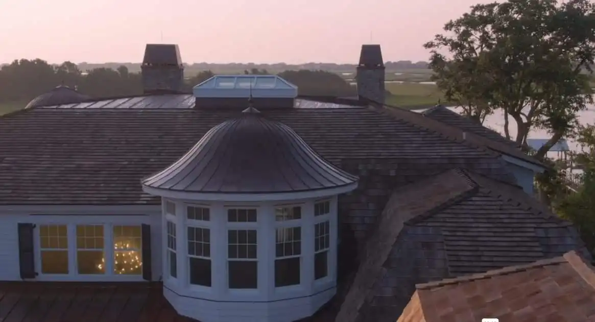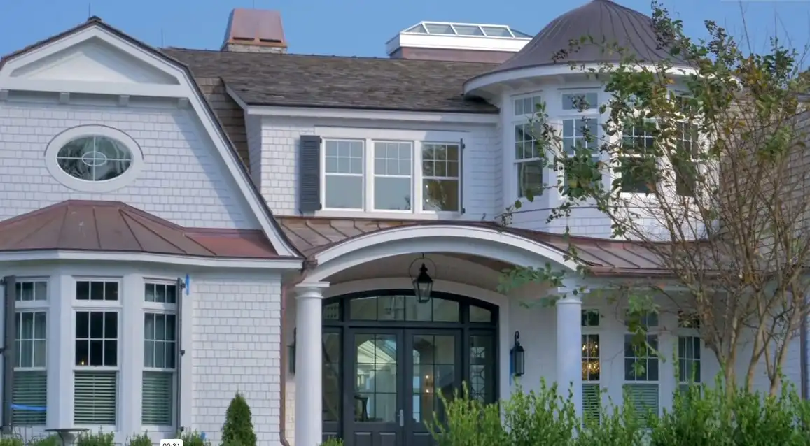 Approaching the property, your eye is drawn to sweeping rooflines, a graceful turret, and a finely detailed shingle-style exterior accented with copper roofing. The home commands presence without ostentation—its curves and symmetry hinting at the architectural mastery within. Stone walkways wind through manicured gardens, leading to a stately entry framed by grand columns and warm lighting, setting the tone for the elegance inside.