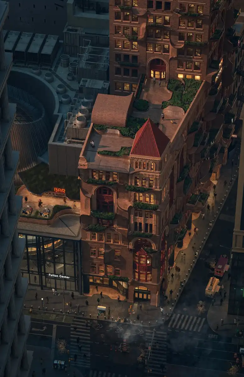 The intervention uses food as the primary medium for this connection, weaving it through every level of the city. Underground, Mo proposes transforming the circulation links to the adjacent Fulton Center transit hub into a bustling public food court, turning a transient corridor into a destination. Above, the design reclaims the underutilized rooftop of the Fulton Center, converting the barren surface into a vibrant roof bar that engages the skyline.