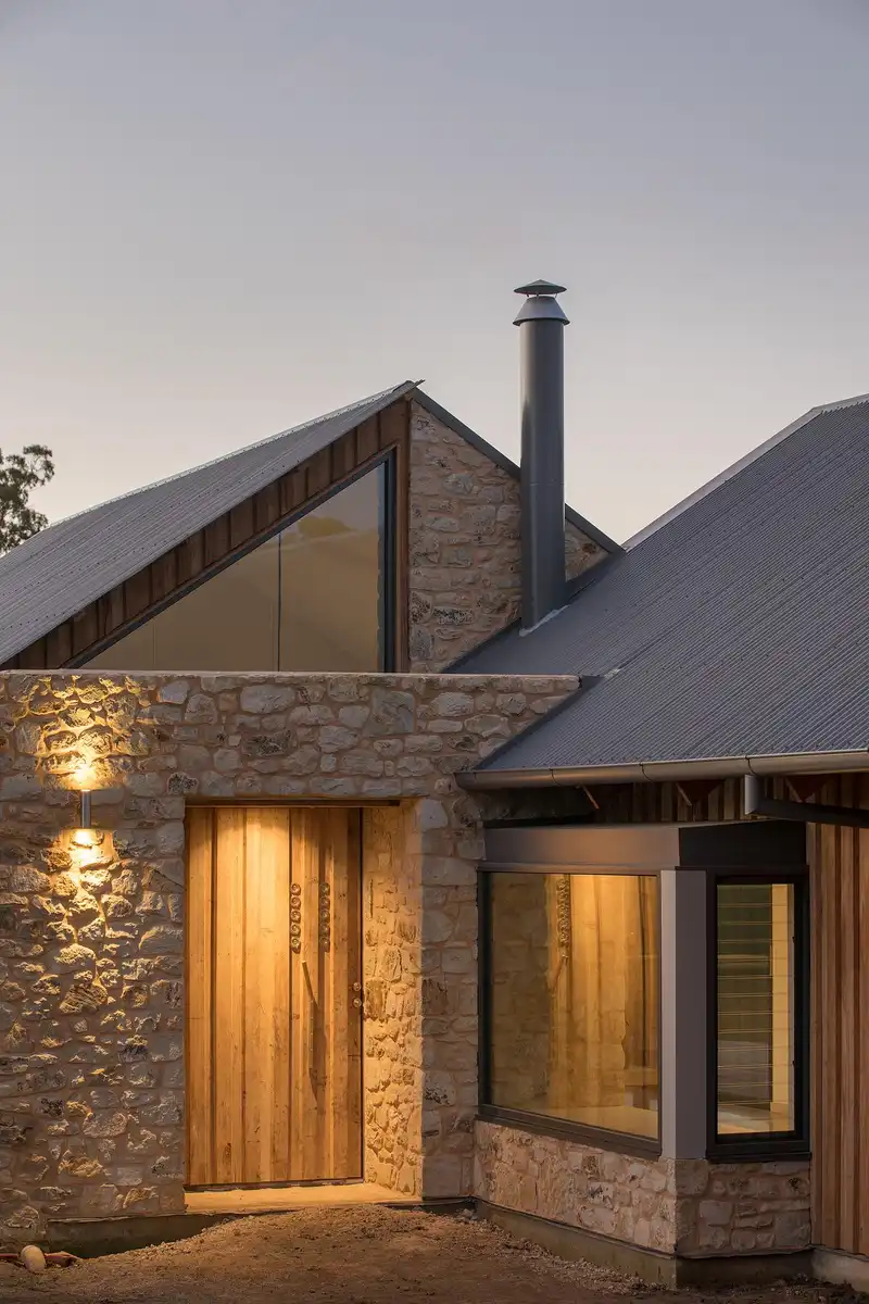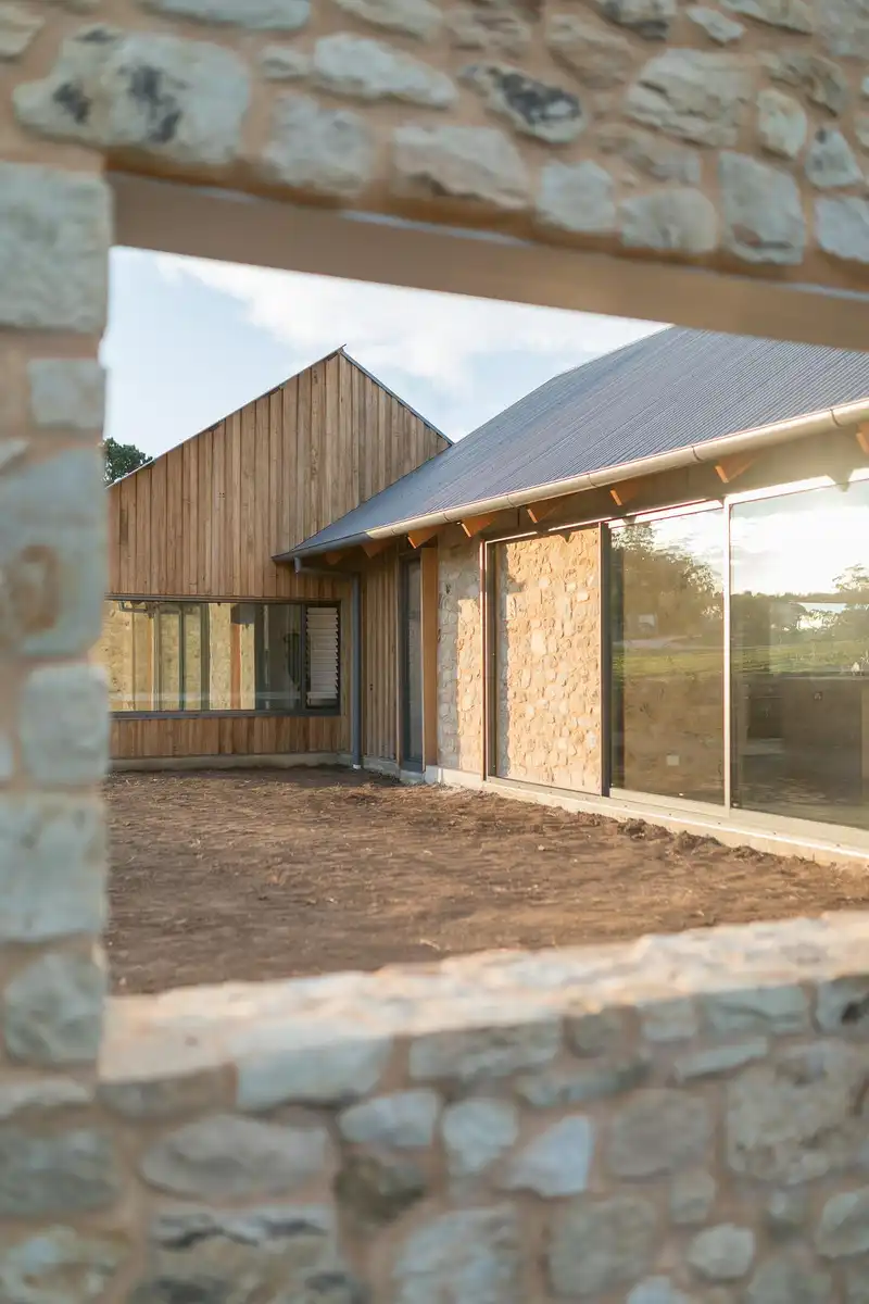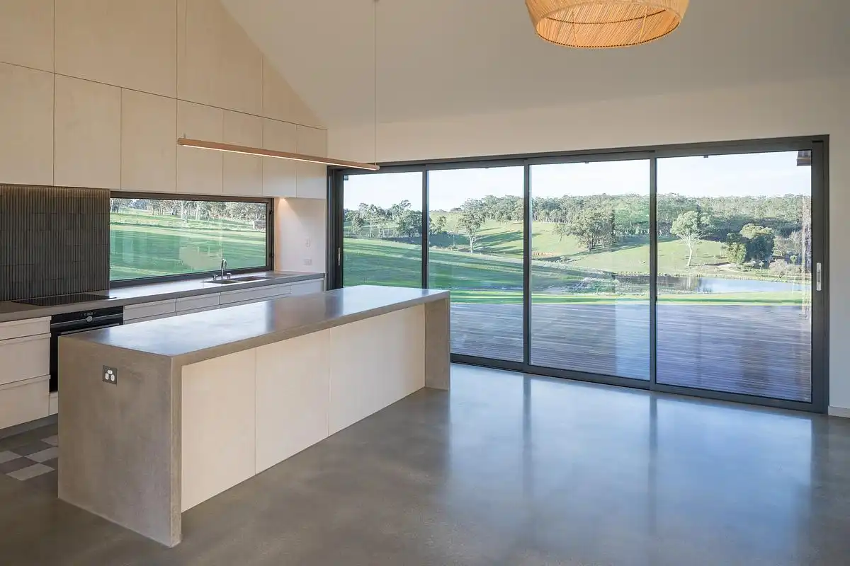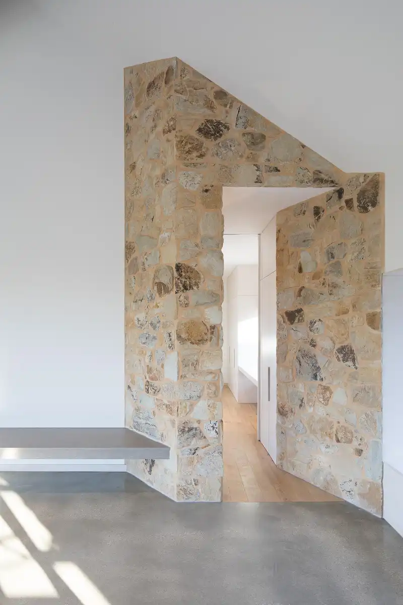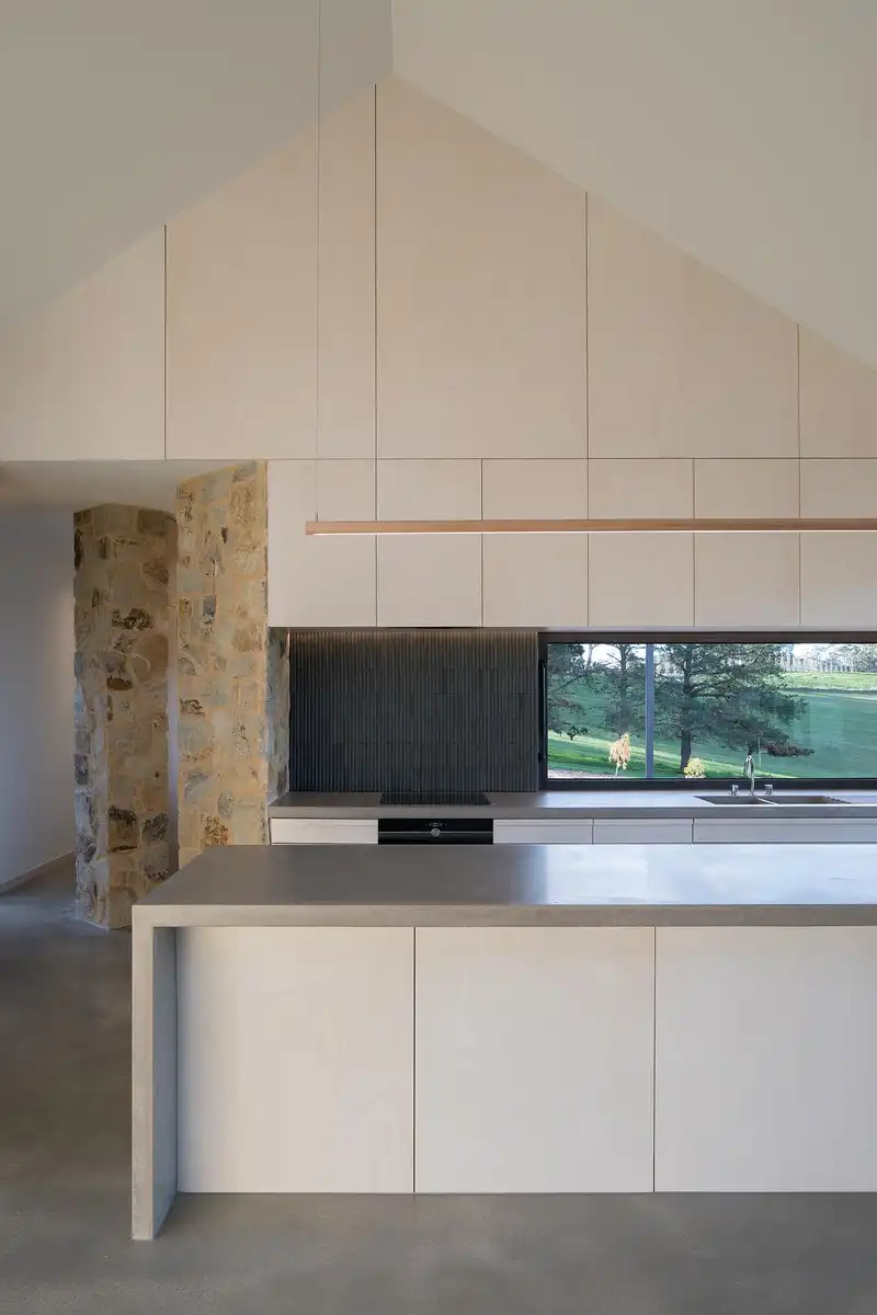The stonework continues inside and is set against hardwearing and unpretentious materials. Polished concrete floors and benchtops, whitewashed plywood joinery and white walls play off against the strong character of the internal stonework.