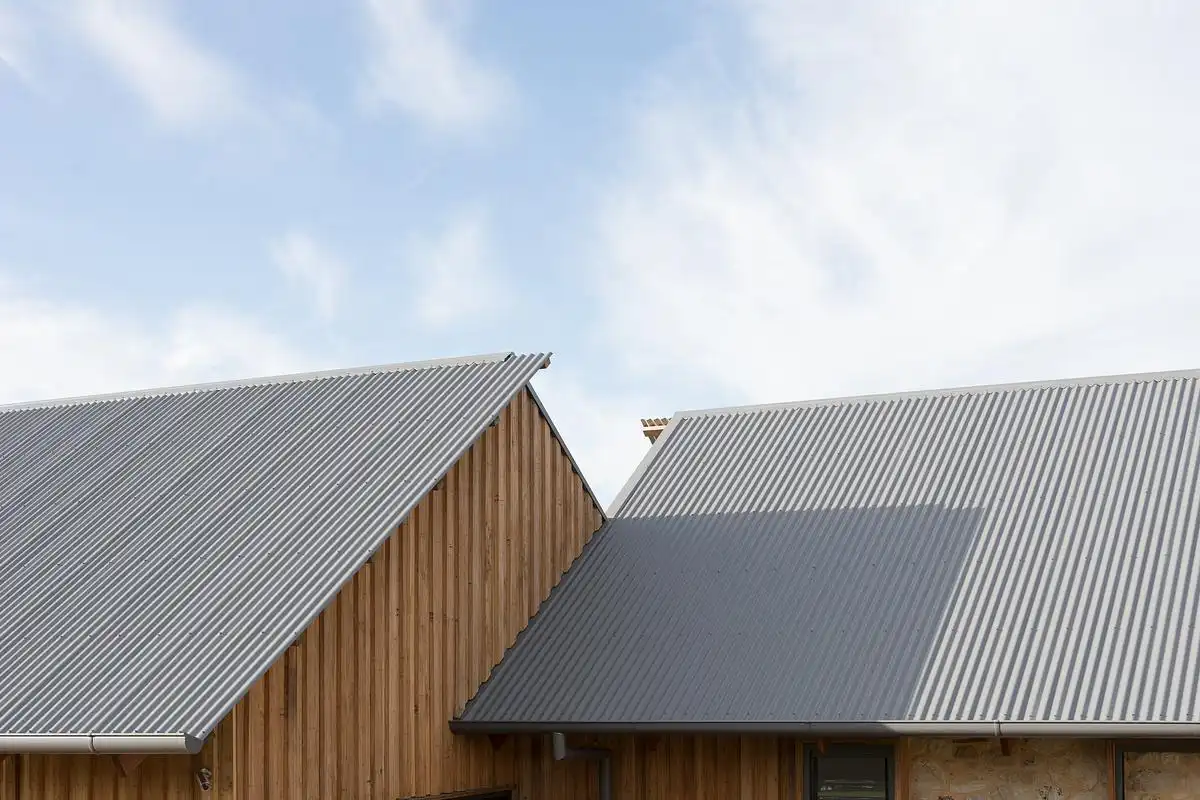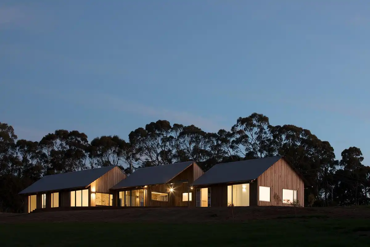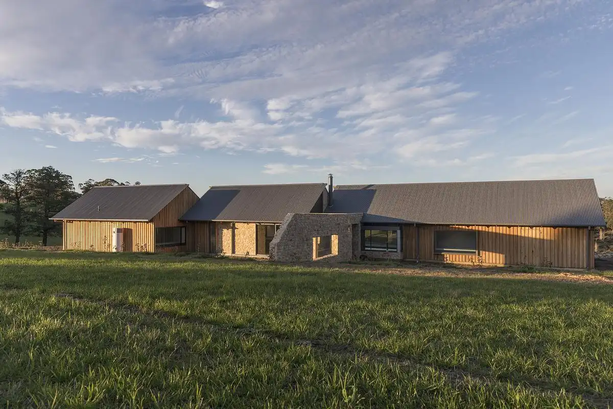 The House in the Hills is positioned on the gentle slopes of a former cow paddock between Echunga and Mount Barker in the Adelaide Hills. The elongated plan of the design is stretched out following the topography of the site, keeping excavations as shallow as possible and allowing almost all of the rooms in the house to enjoy the picture views across the paddock down to the site’s dam.