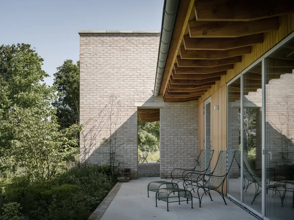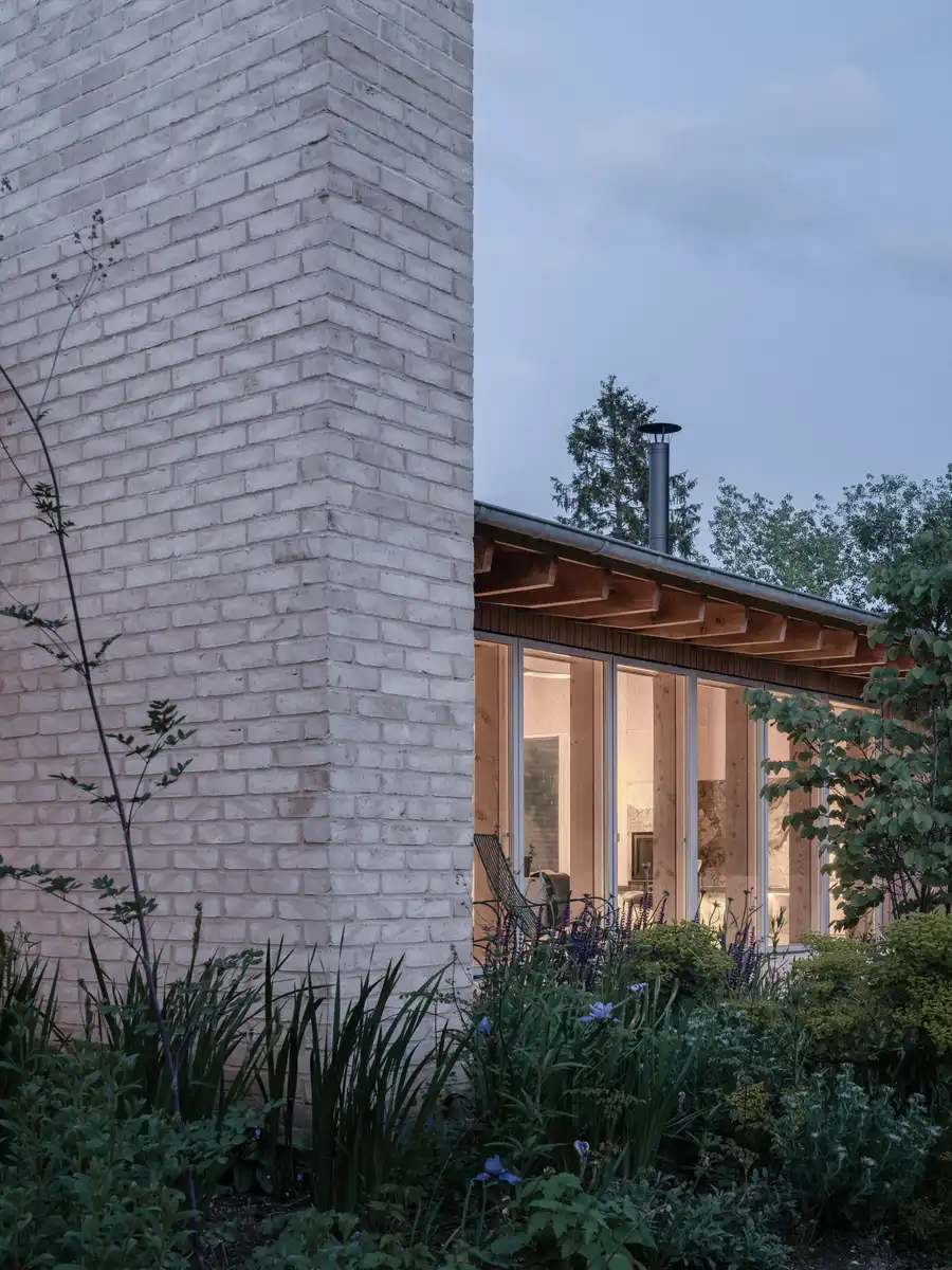 To the north-west and north-east are the quadrants for the family bedrooms and garage respectively, while the guestrooms are to the south-east, and the main dining and living spaces to the south-west. Here the interior aesthetic is at its most successful, giving off the calm and airy atmosphere of post-war Scandinavian architecture through its fair-faced brickwork, Douglas fir rafters, open-plan arrangement, and continuous full-height sliding doors opening onto a small patio.