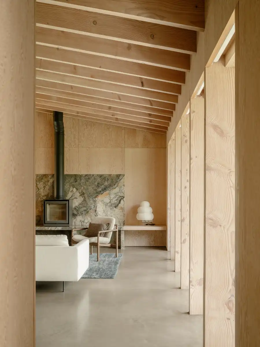 Inside, the Scottish cedar extends across the interior walls, creating a cocooning warmth in striking contrast to the wild surroundings. Expansive open-plan living areas flow seamlessly into quieter ancillary spaces, while generous floor-to-ceiling windows on all sides frame shifting sunlight and rural views.