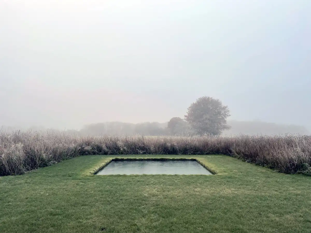 Beyond the main central axis there is an open view of the fields punctuated by a clear square pool of water surrounded by a perennial meadow. So, both in the landscaping response, executed by the client as the garden designer, and the ‘light touch’ of the original form and structure by the architects, the building has been renewed for future generations with respect.