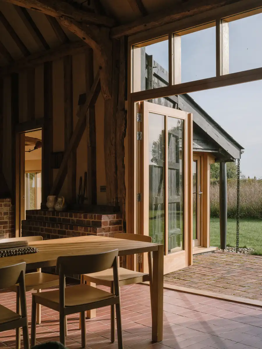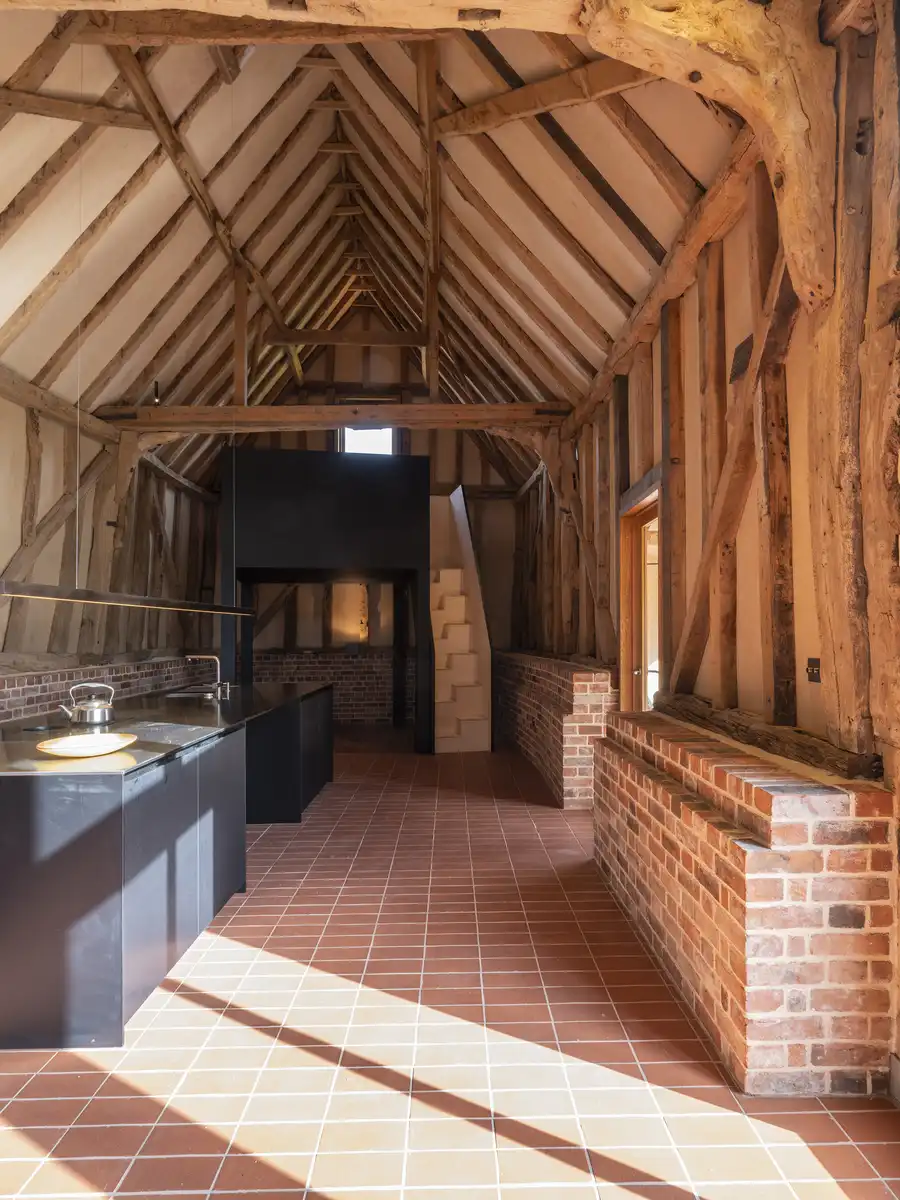 The main entrance is via the old barn doors, symbolically retained but flung open to reveal the new glazed screen, door and the barn structure. Inside, the painstakingly restored original timber structure is fully revealed, with replacement components, also in oak, left square in contrast to the older, more worn elements.