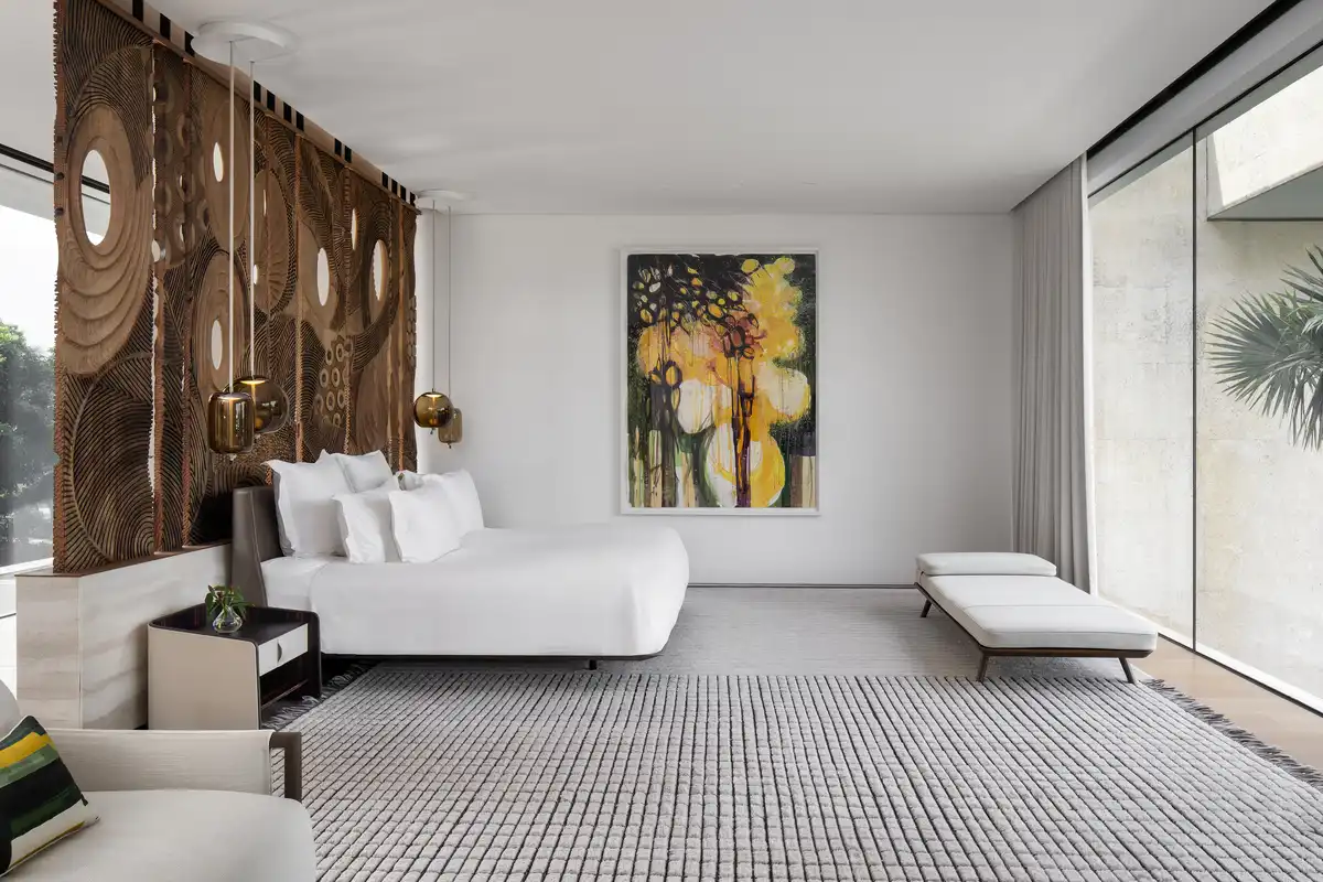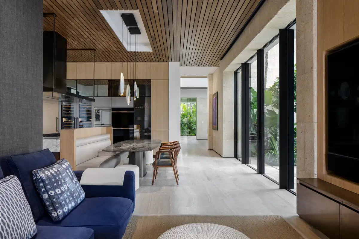 Landscape design by Raymond Jungles furthers the connection between building and site. Gardens and courtyards act as outdoor rooms, planted with native species and interspersed with water features and artworks, including a prominent sculpture by Lionel Smit. These spaces are not ornamental but spatial — woven into the architecture to offer moments of retreat, transition, and reflection. The planting strategy is both ecologically responsive and resilient, supporting year-round growth in a humid, coastal climate.