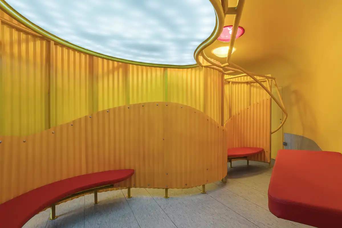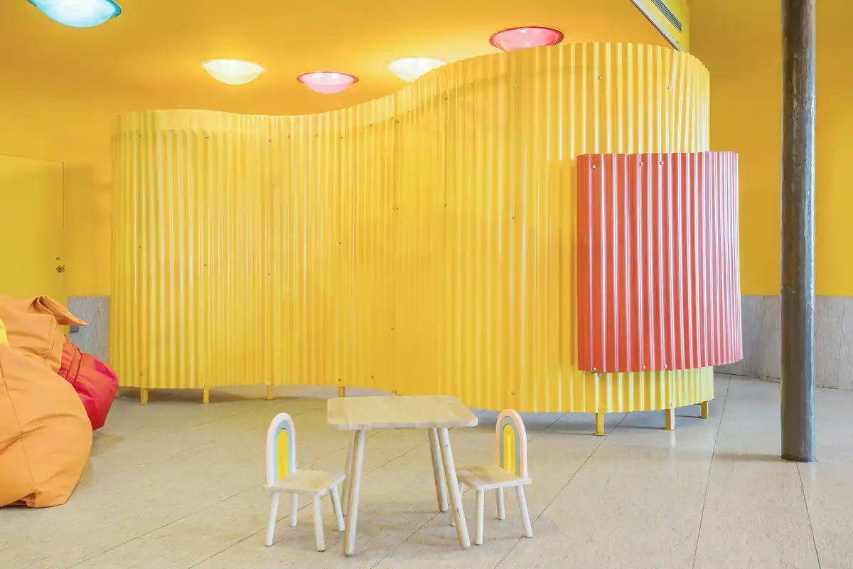 In keeping with the park’s playful and vibrant theme, the surrounding walls and ceilings are painted in a bright yellow-orange color, enhancing the cheerful atmosphere. The incorporation of tactile, easy-to-maintain functional furniture encourages informal seating, allowing visitors to relax and rest comfortably.