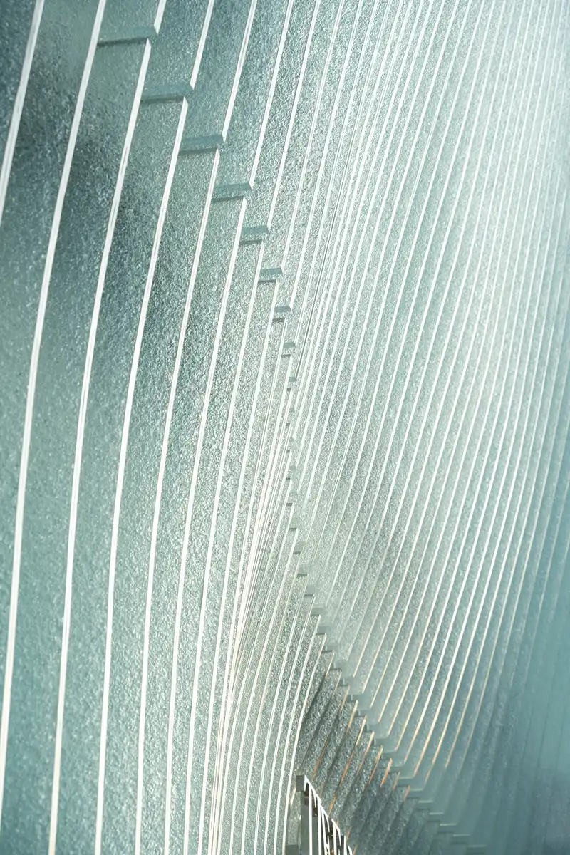 The façade is designed to be demountable, allowing the glass fins and mounting brackets to be removed without damage and enabling the possibility for these components to be reused or recycled at the end of their lifespan.