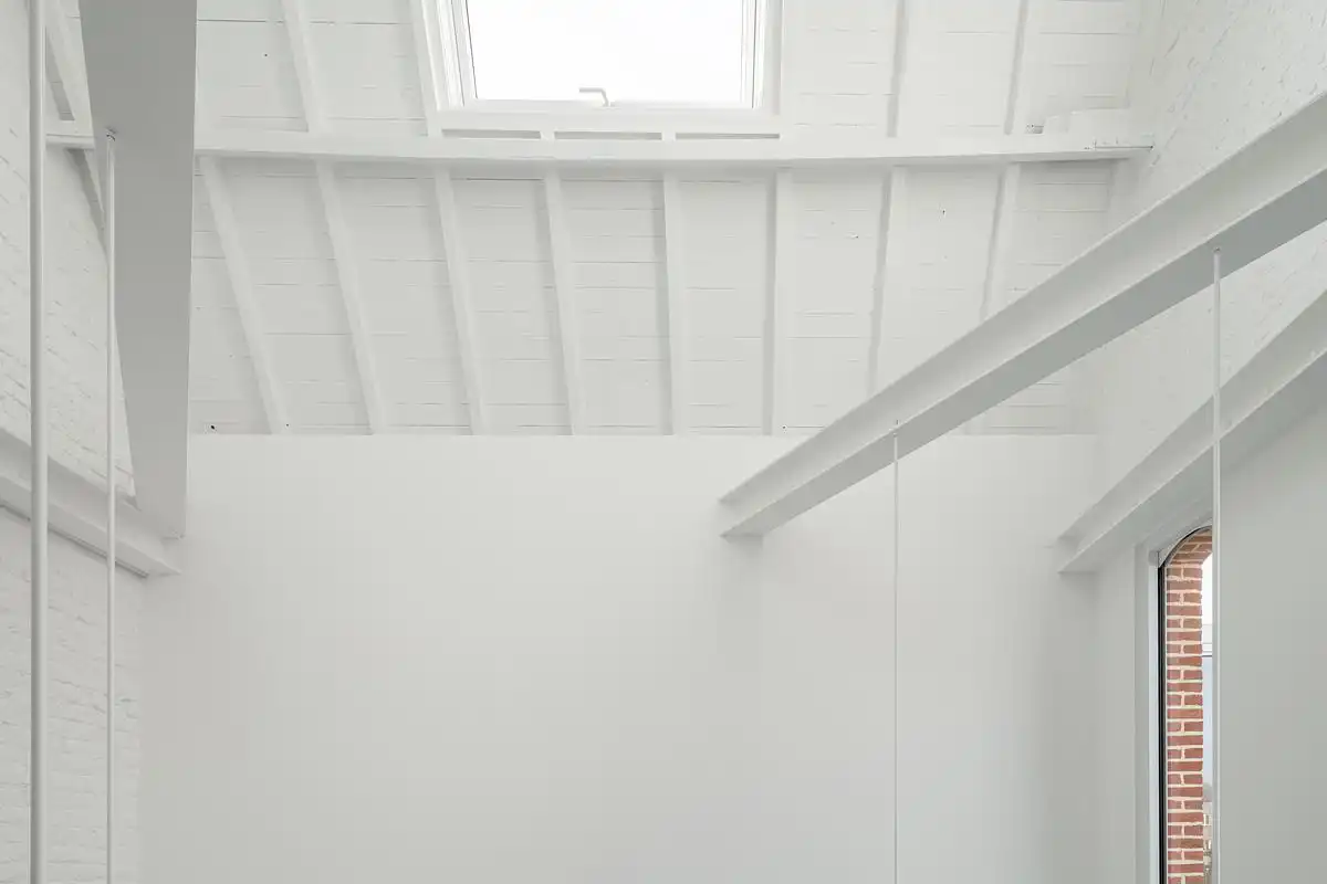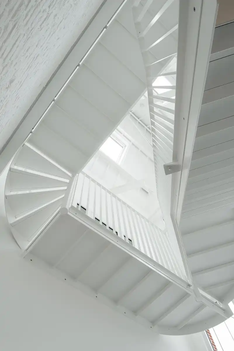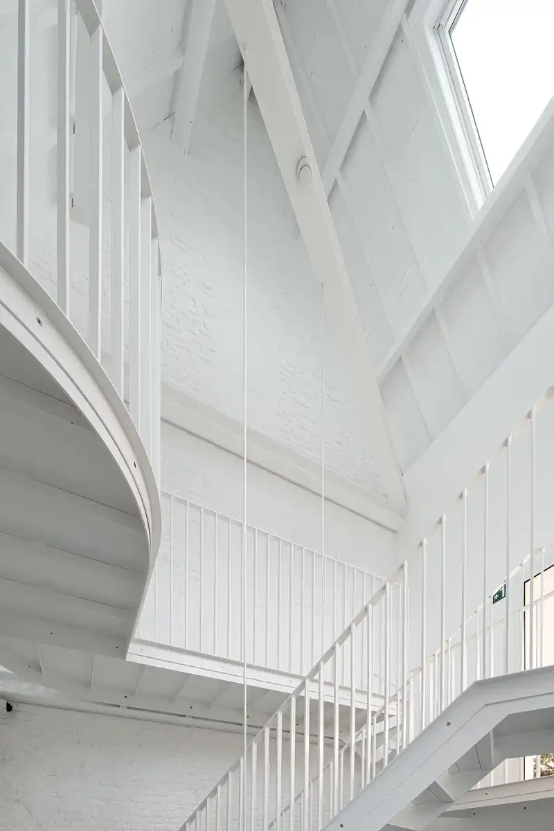 Inside the manor, the tower was hollowed out. With all floors removed, a tall vertical void emerged, animated by a steel stair suspended on cables. The stair makes a soft, flowing gesture, linking the offset levels between the manor and the new volume.