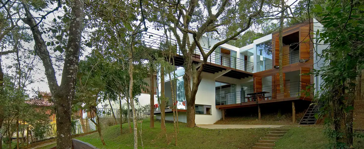 The 158 m² residence is organized into three horizontal volumes distributed over two floors, in the city of Brumadinho, 30 minutes from Belo Horizonte. Set into a steep site with a 45º slope, the house was designed with minimal earthworks, avoiding any cuts that would require retaining walls. The project prioritizes the preservation of native trees and takes special account of the strong presence of jacaranda trees that weave through the spaces.